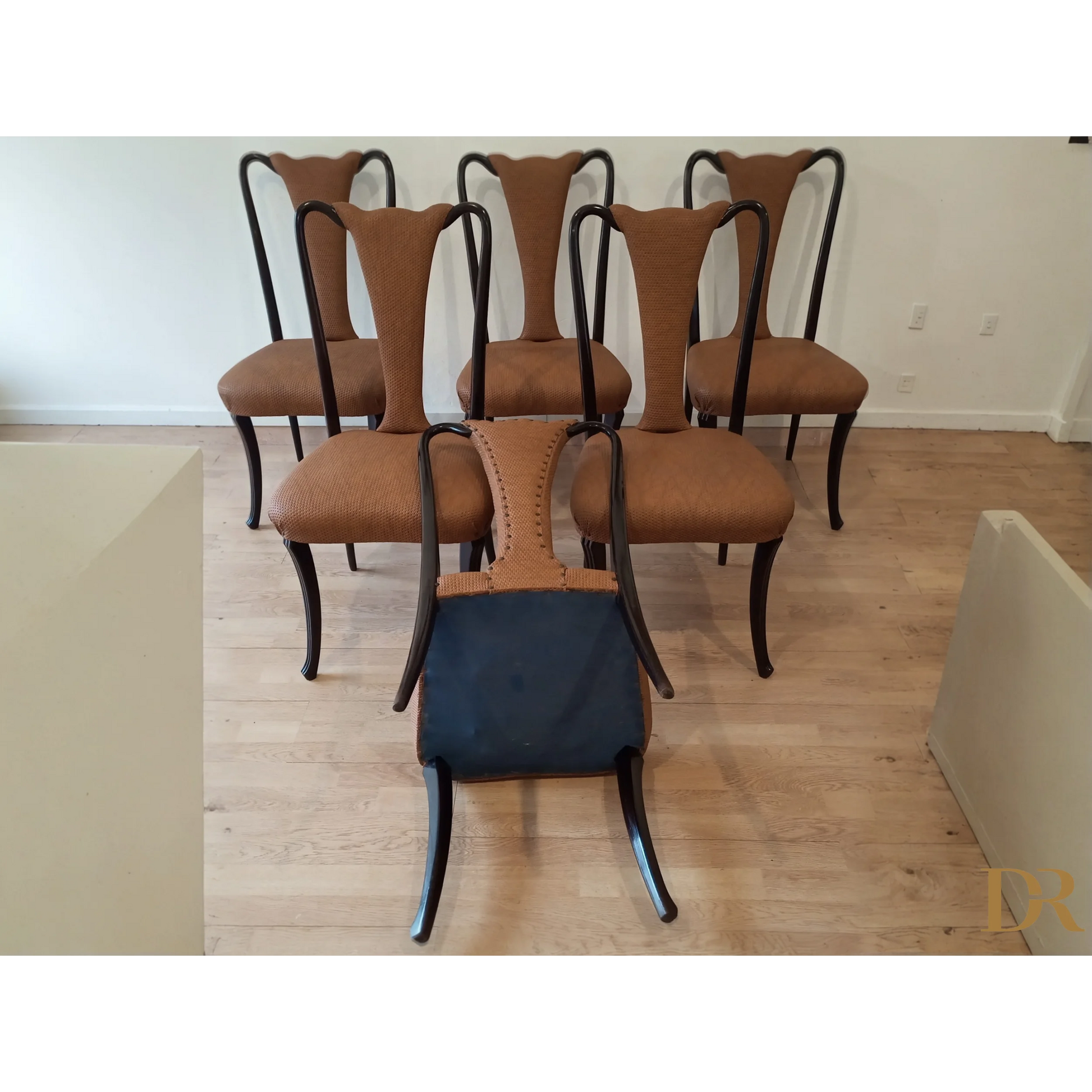 La pelle di queste sedie è particolarmente unica, mantenuta in condizioni di conservazione ottima, testimonianza della qualità dei materiali scelti all'epoca. Ogni dettaglio è stato curato con precisione: il disegno sul retro, creato attraverso la chiusura della tappezzeria in ottone, non è solo funzionale ma aggiunge anche un elemento estetico distintivo. Realizzate in legno di mogano, sono sedie difficili da trovare in tali condizioni, rendendole un'opportunità imperdibile per gli amanti del design e del vintage.
