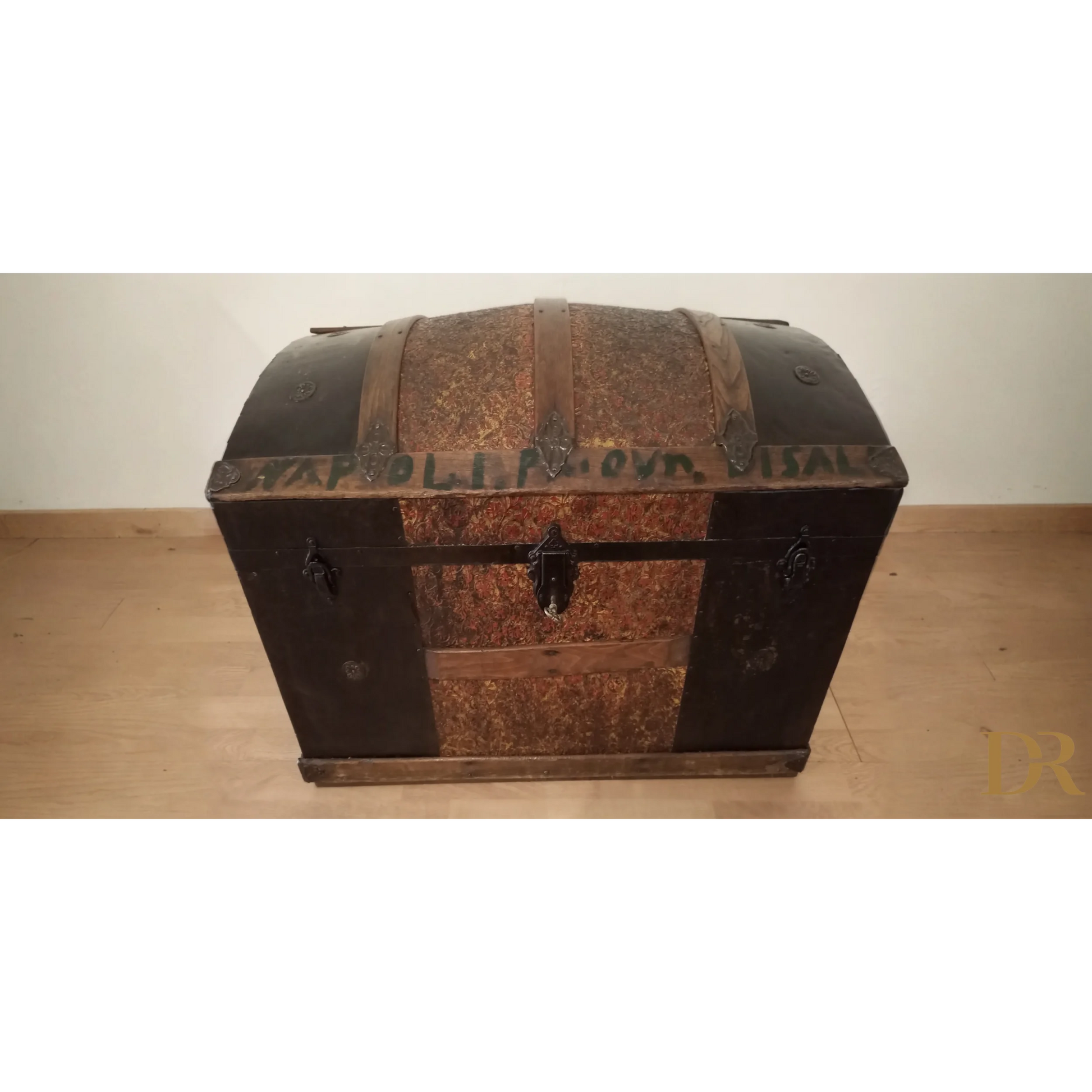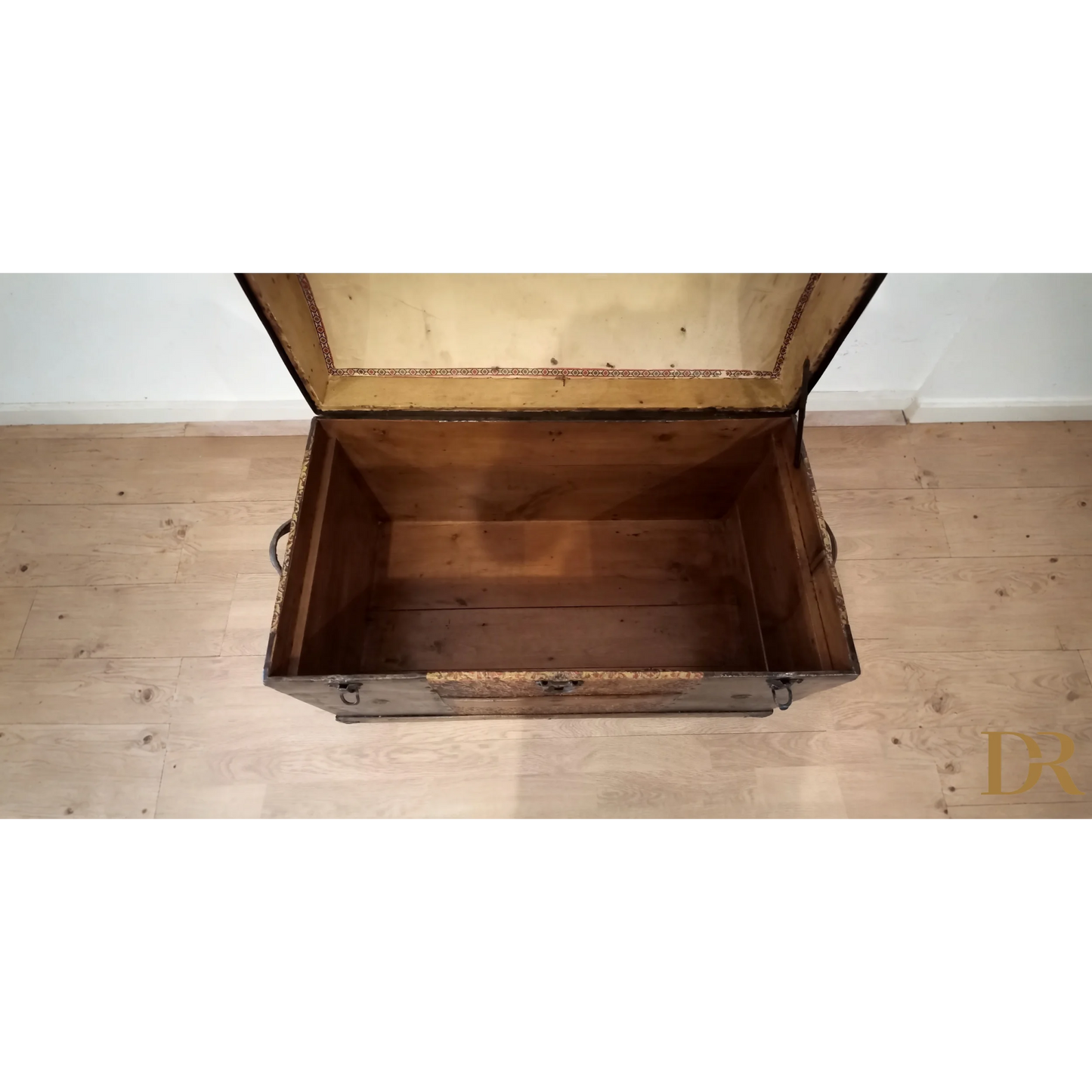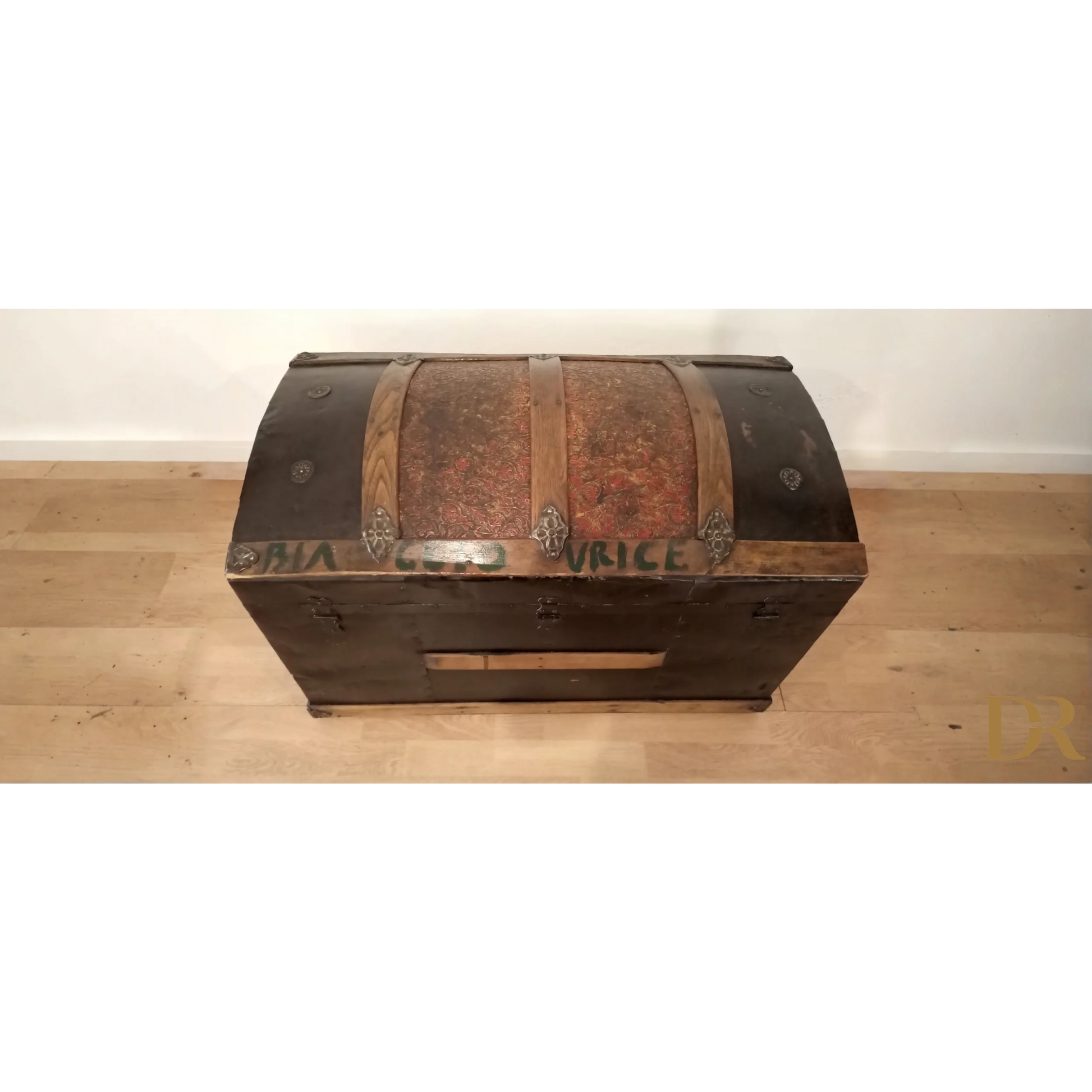 Antico baule bombato epoca 800 forziere legno e metallo. Restaurato