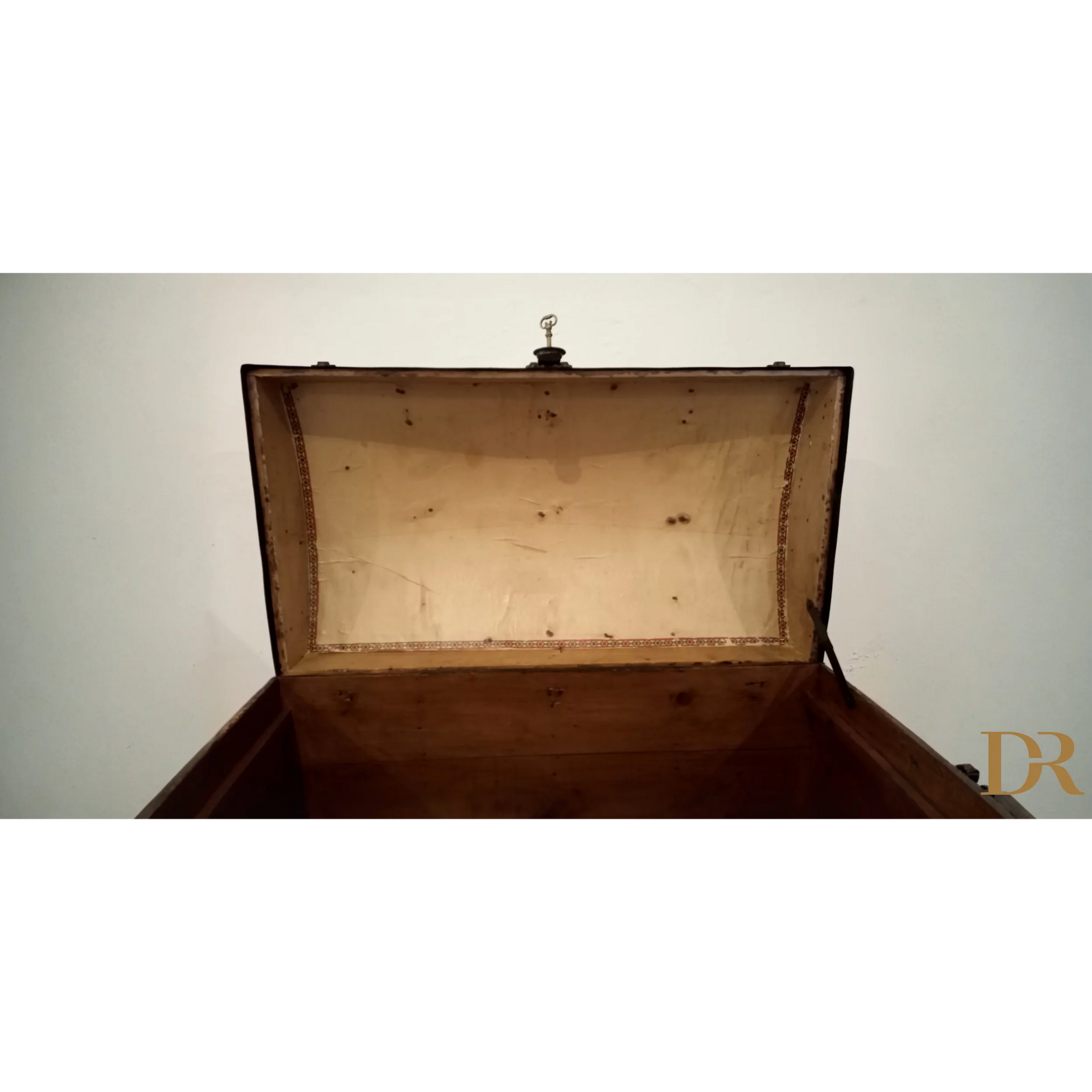 Forziere in legno e ferro esteticamente molto gradevole, un antico baule bombato che si distingue per la sua robustezza e la cura dei dettagli. Realizzato in legno di pioppo, il corpo del forziere è rivestito con ferro lavorato e decorato su tutta la superficie, aggiungendo un tocco di eleganza classica. Rinforzi esterni in legno duro, probabilmente rovere, conferiscono ulteriore solidità a questo pezzo d'epoca.