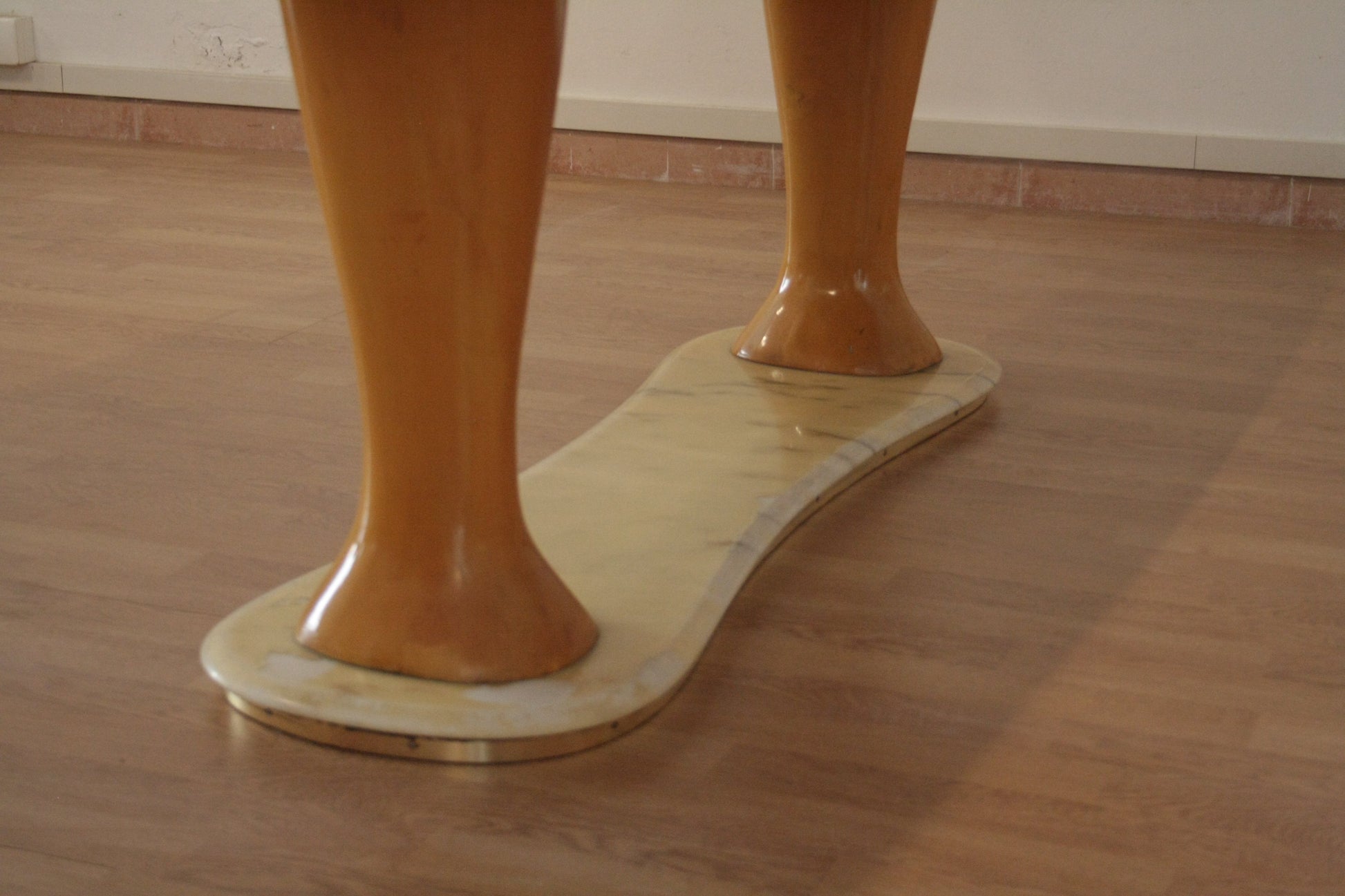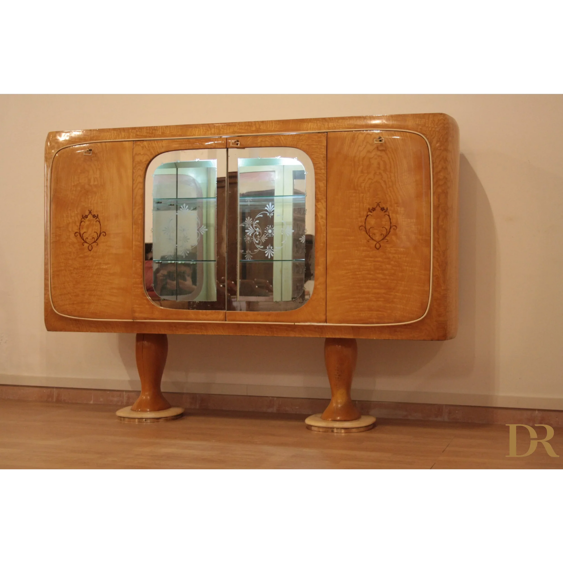 E' composta da un mobile bar in legno chiaro presumibilmente acero e gli intarsi sono in legno scuro. La filettatura bianca che contorna il profilo da un ulteriore tocco di eleganza ad un mobile moderno a attuale. Piano in vetro nella parte superiore, la parte interna centrale è in cristallo specchiato con decori, le ante centrali in vetro decorato e argentato, retto da due colonne in legno massello, con basi in marmo e finitura ottone. In ottime condizioni, come da foto.