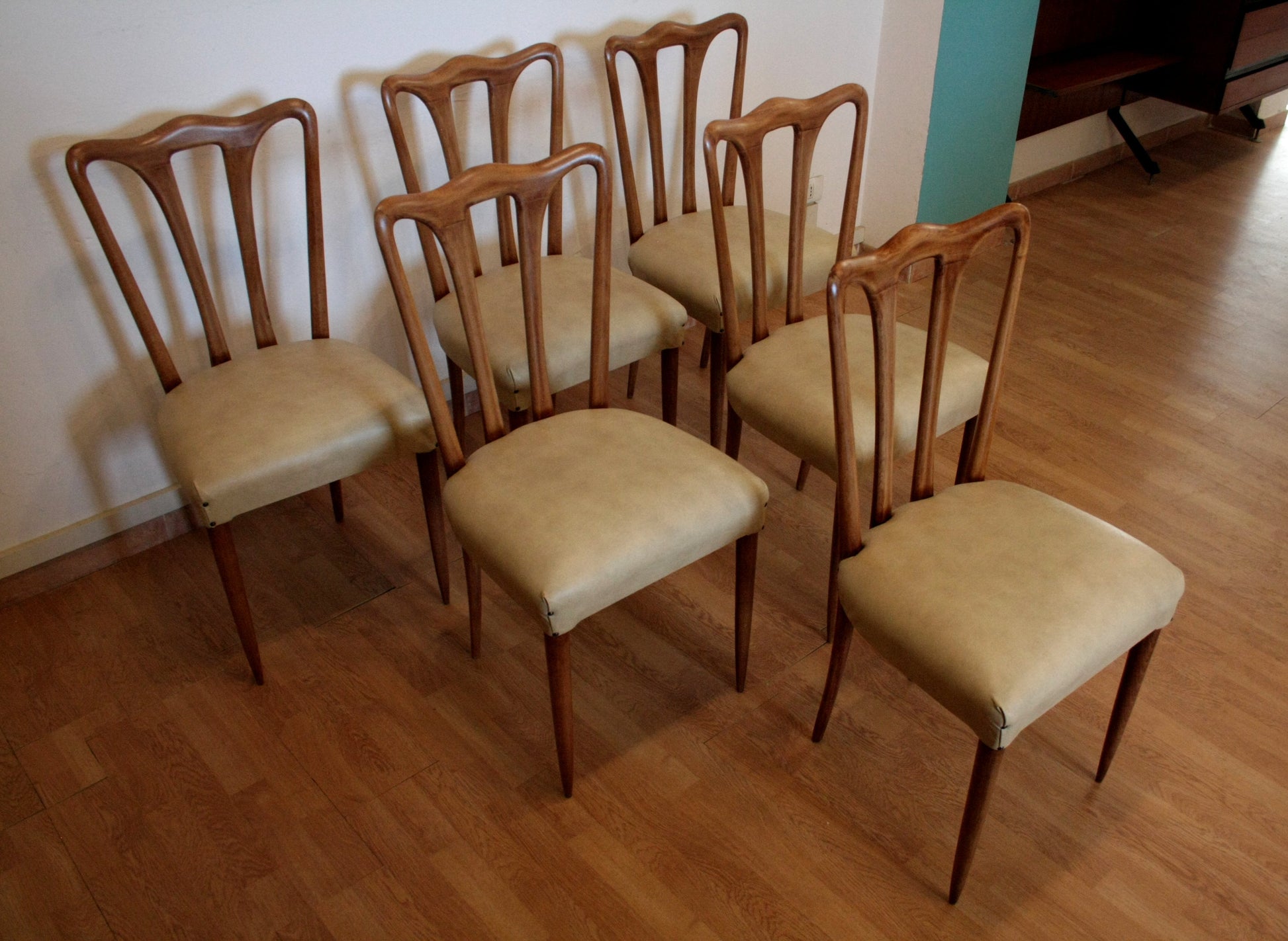 Sei sedie in legno massello e rivestimento originale in ecopelle, inserti in ottone. In ottime condizioni.