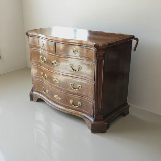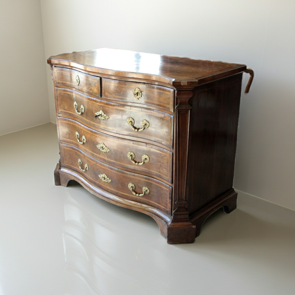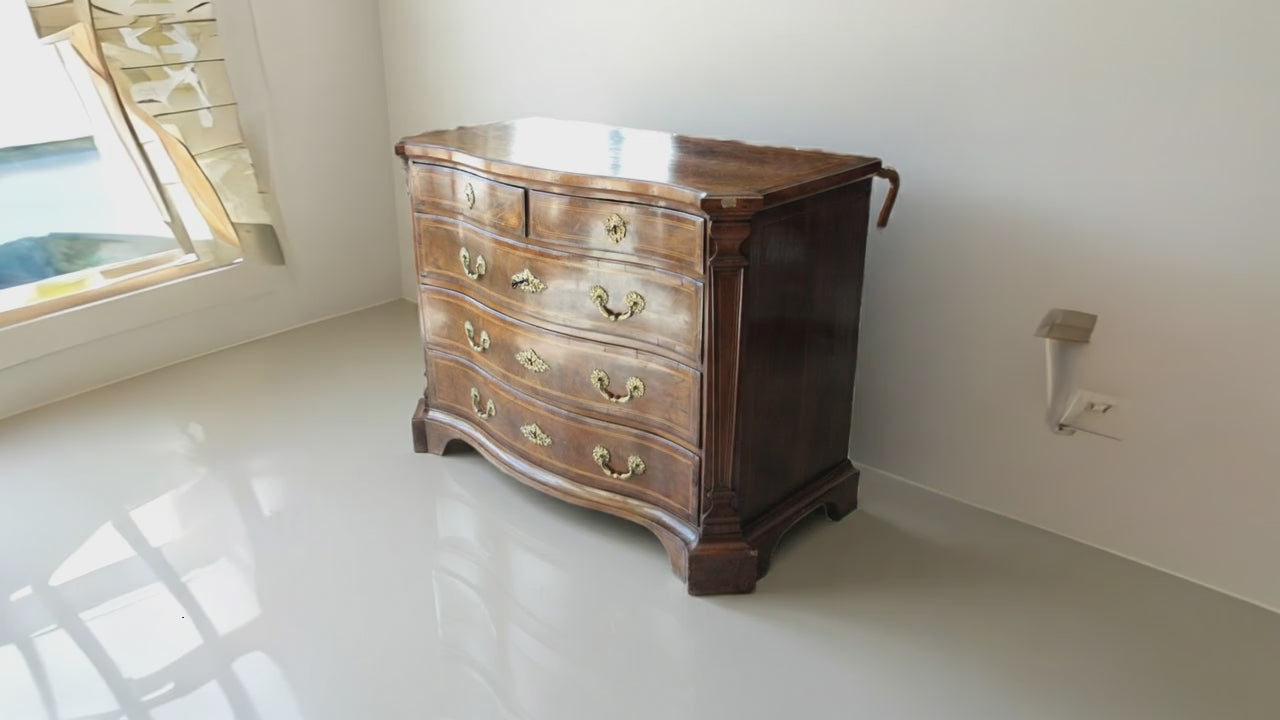 Raffinato cassettone in legno di noce, caratterizzato da una linea elegante e mossa con un fronte ricurvo che conferisce dinamicità alla sua forma. La struttura prevede due cassetti più piccoli nella parte superiore, ideali per oggetti di piccole dimensioni, e tre cassetti maggiori sottostanti che offrono ampio spazio di contenimento. Tutti i cassetti sono impreziositi da maniglie in bronzo, che ne sottolineano l’autenticità e il valore artigianale. Il design riflette chiaramente l’influenza del periodo Luigi XV, noto per le sue curve morbide e dettagli raffinati, un tratto distintivo che ha segnato anche l’ebanisteria spagnola di quel tempo. Con dimensioni di 133 cm di lunghezza, 64 cm di profondità e 103 cm di altezza, il canterano si inserisce con eleganza in ambienti classici e di prestigio, garantendo funzionalità e stile intramontabile.