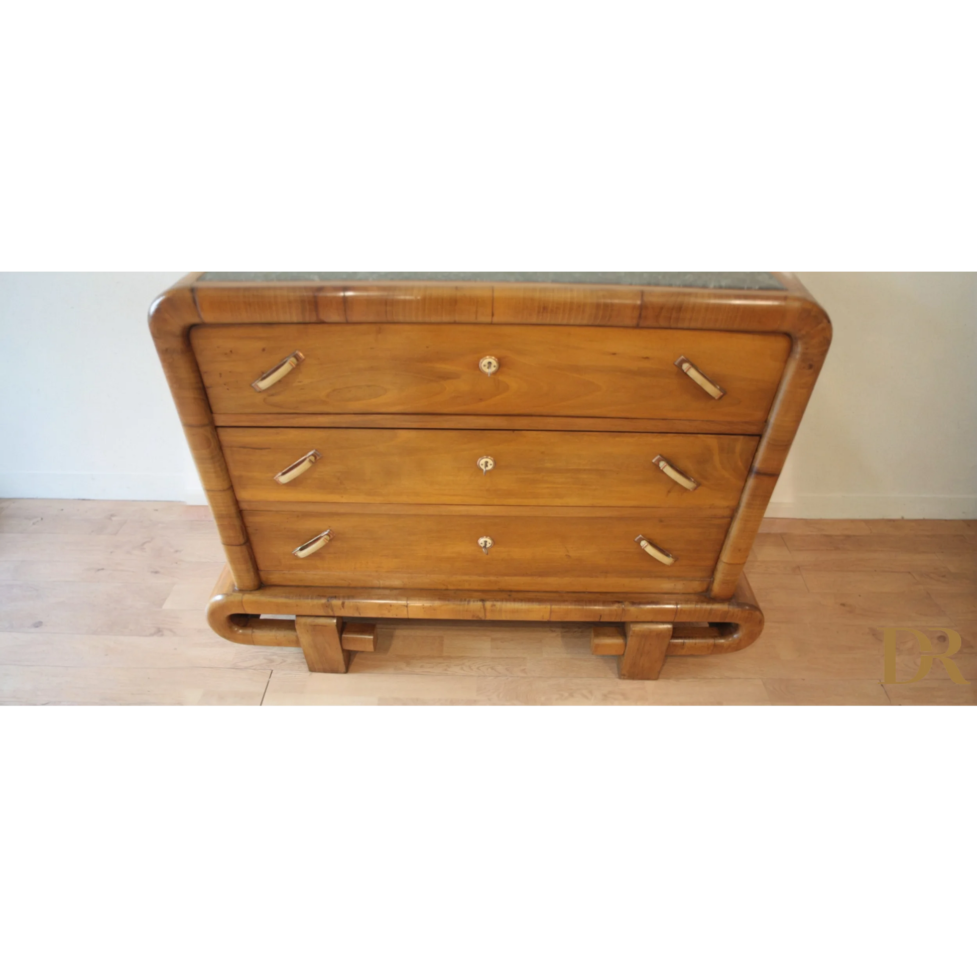 Linea tipica dei mobili Decò con una base molto particolare non frequente di questa qualità nei mobili di metà secolo. Moderni nel profilo con un piano in marmo superiore in condizioni di conservazione ottime come del resto tutto il mobile, originale in ogni sua parte. Maniglie anch'esse originali in ottone e finto avorio.
