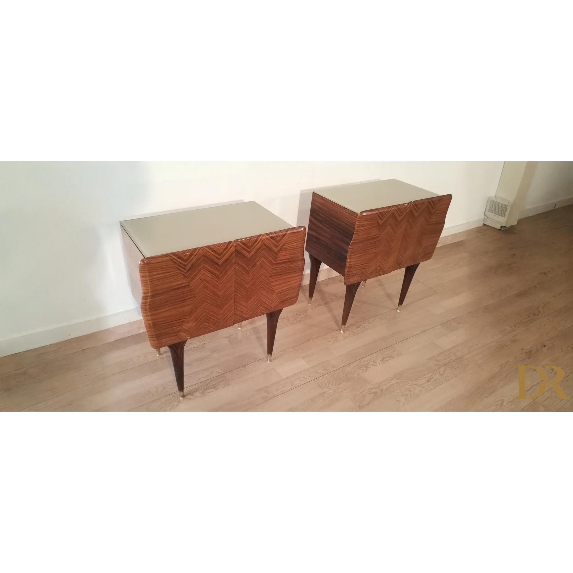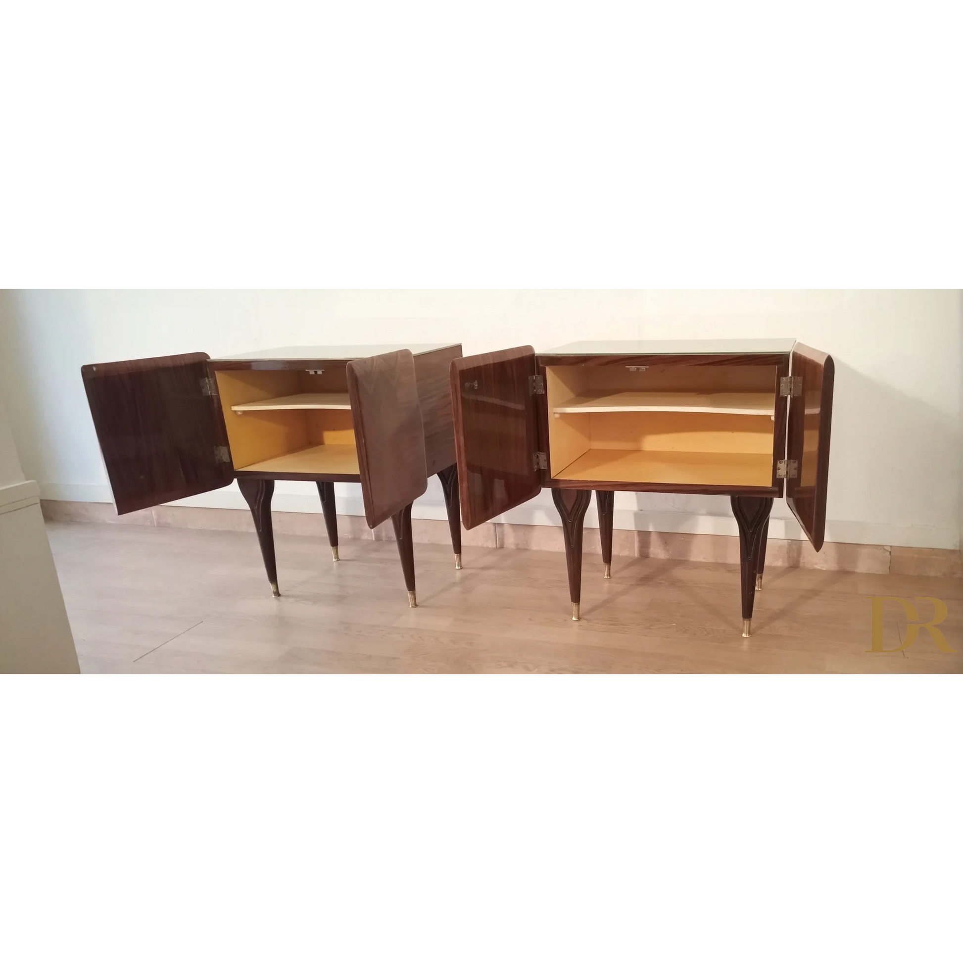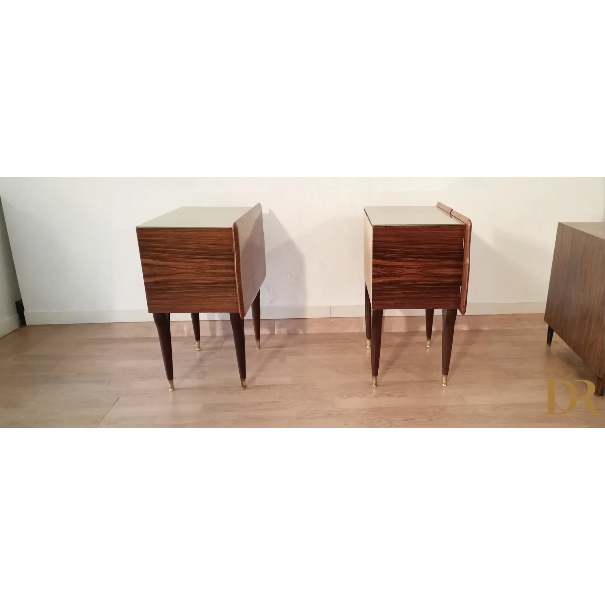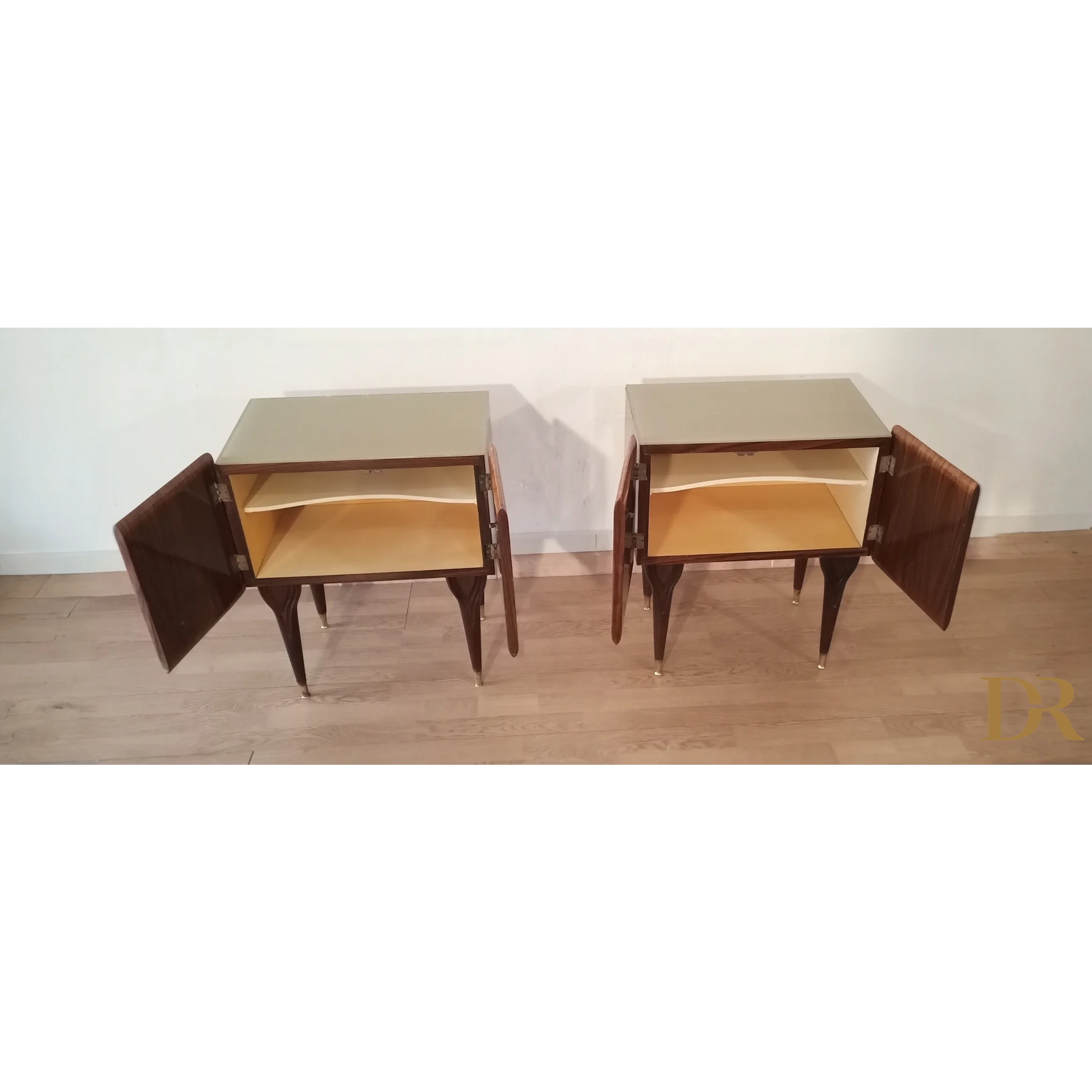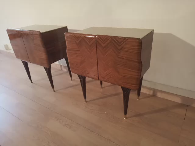Questa coppia di comodini è caratterizzata da una doppia anta frontale in legno, con un piano in vetro verde che crea un accattivante contrasto visivo. I decori in impiallaccio di legno di diverse essenze sui fianchi e sulle ante mettono in evidenza l'attenzione al dettaglio tipica del design Italiano, evocando la maestria artigianale che ha reso famoso il design italico nel mondo. I delicati dettagli in ottone, inclusi le due maniglie e le quattro estremità dei piedi, aggiungono un tocco di classe e raffinatezza, rendendo questi comodini una scelta ideale per una camera da letto elegante e ricercata.