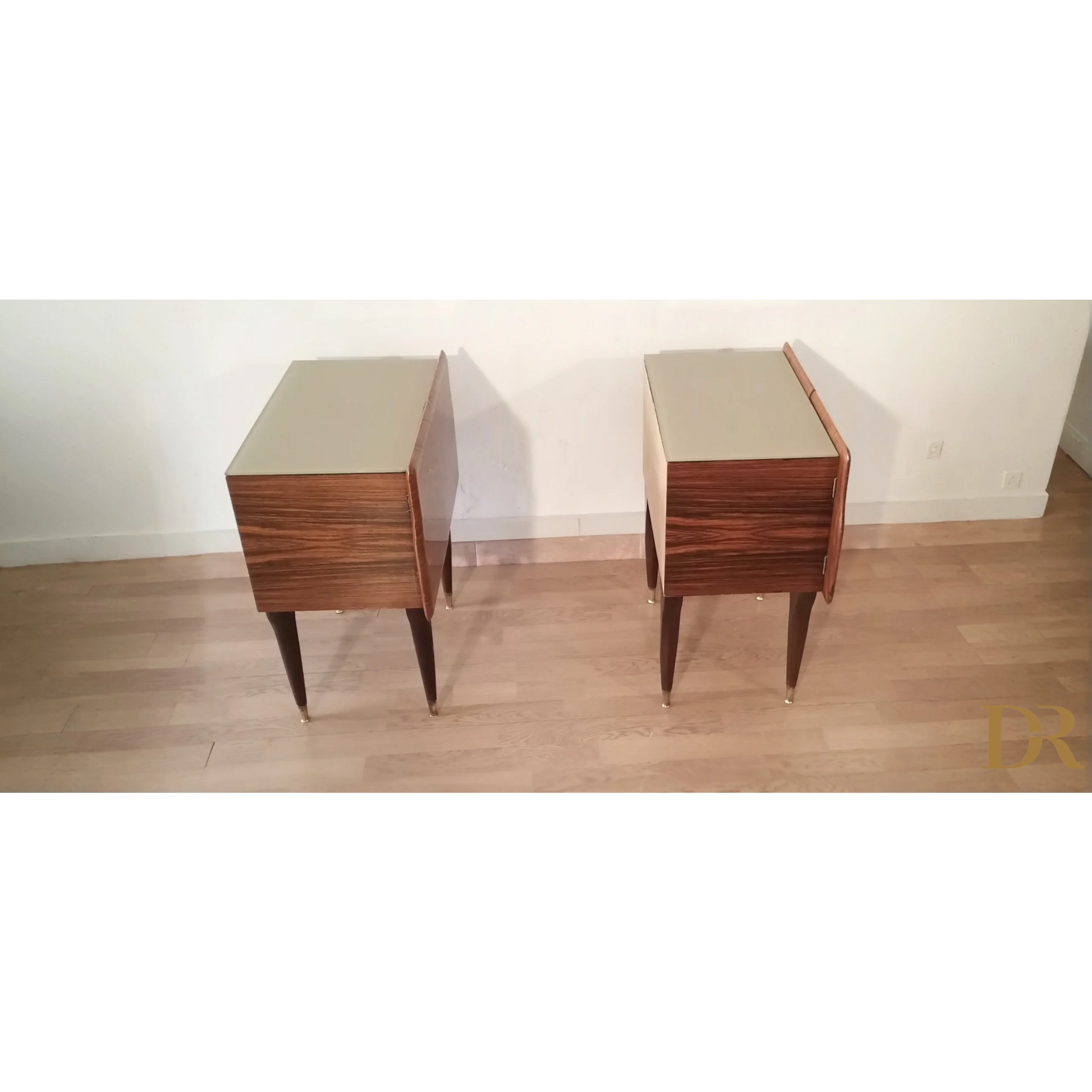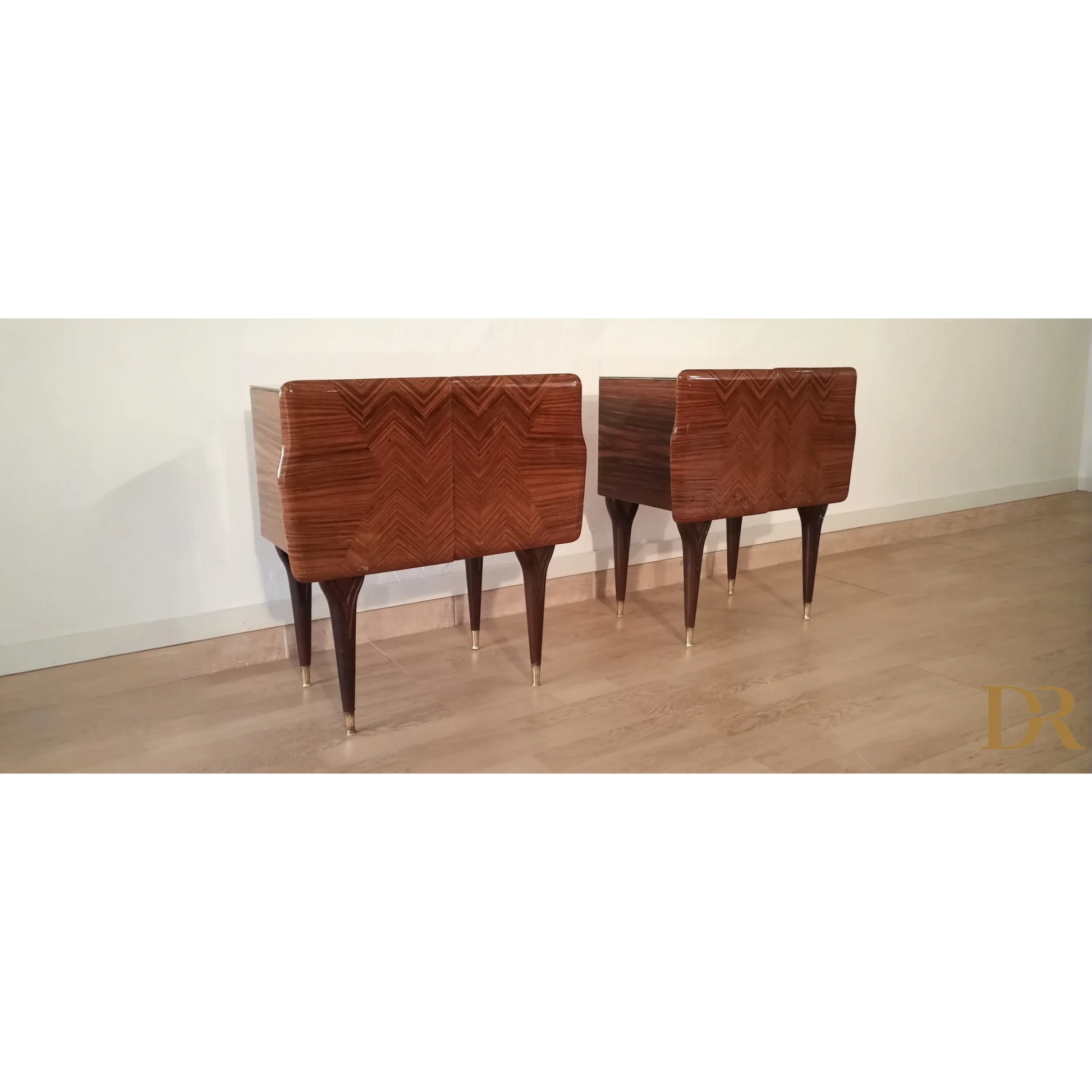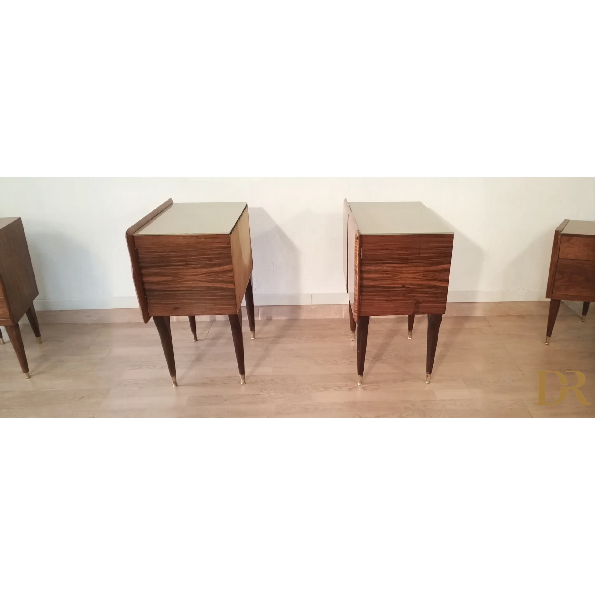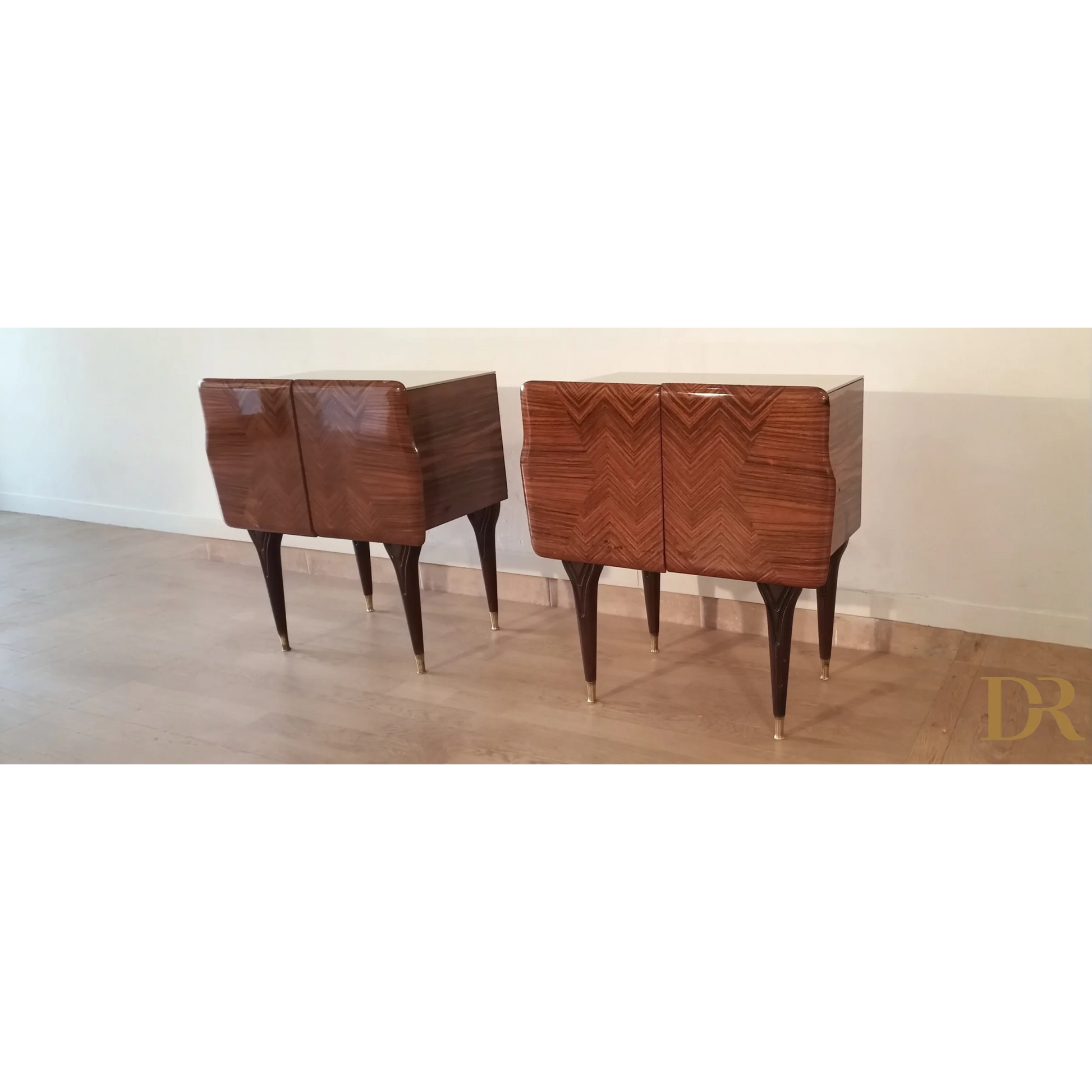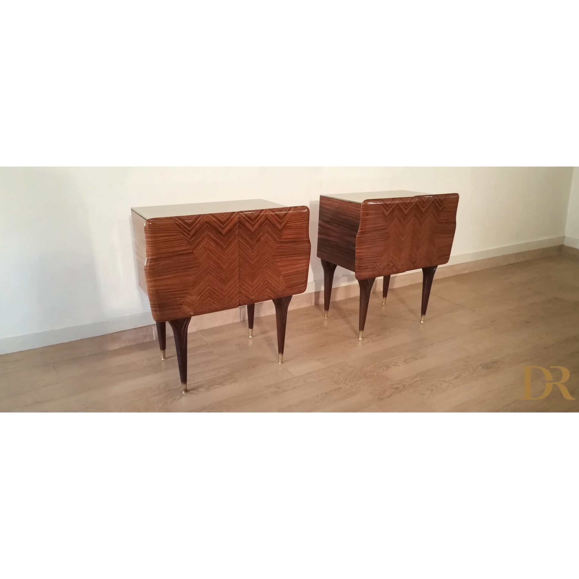 Questa coppia di comodini è caratterizzata da una doppia anta frontale in legno, con un piano in vetro verde che crea un accattivante contrasto visivo. I decori in impiallaccio di legno di diverse essenze sui fianchi e sulle ante mettono in evidenza l'attenzione al dettaglio tipica del design Italiano, evocando la maestria artigianale che ha reso famoso il design italico nel mondo. I delicati dettagli in ottone, inclusi le due maniglie e le quattro estremità dei piedi, aggiungono un tocco di classe e raffinatezza, rendendo questi comodini una scelta ideale per una camera da letto elegante e ricercata.