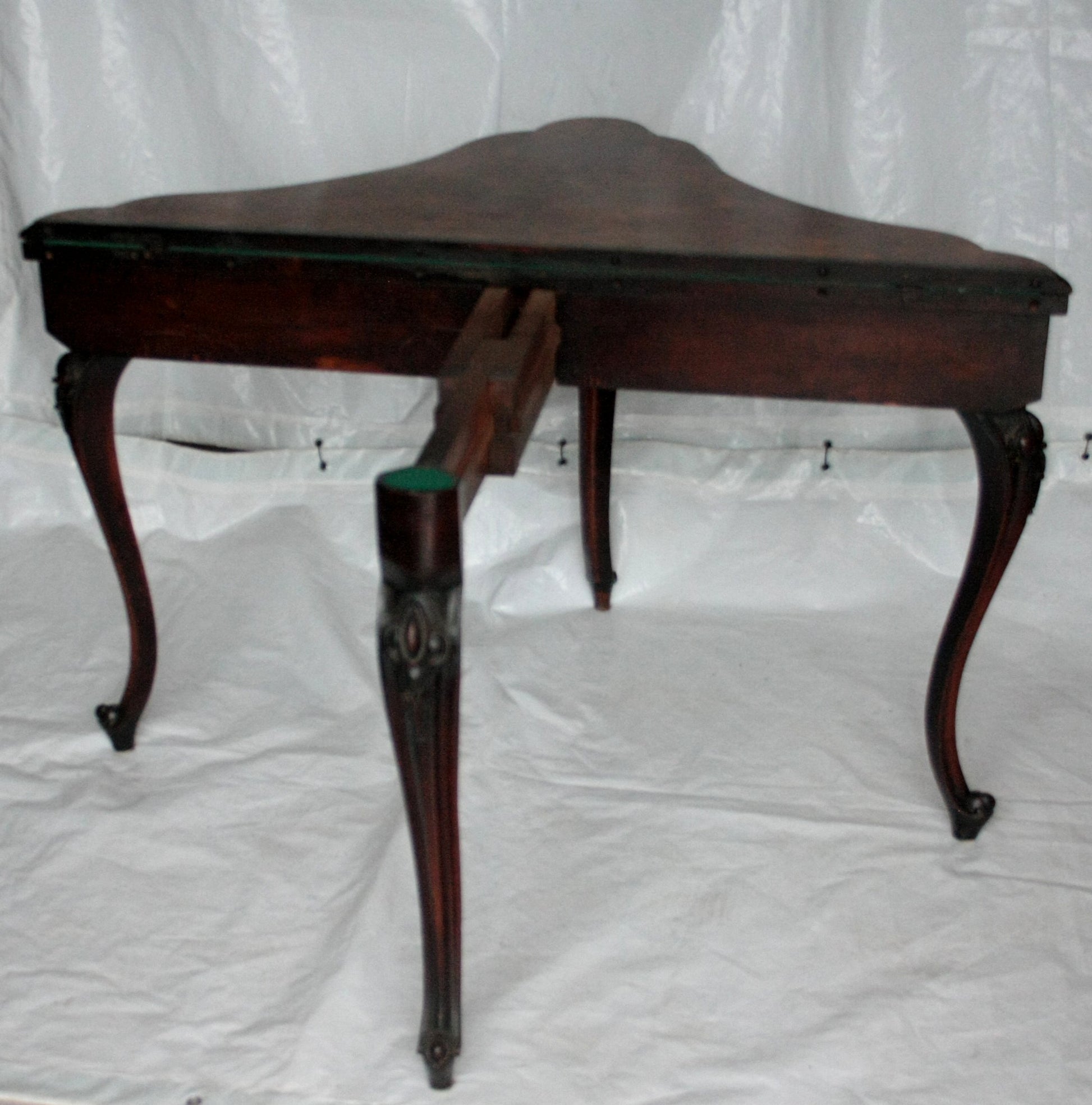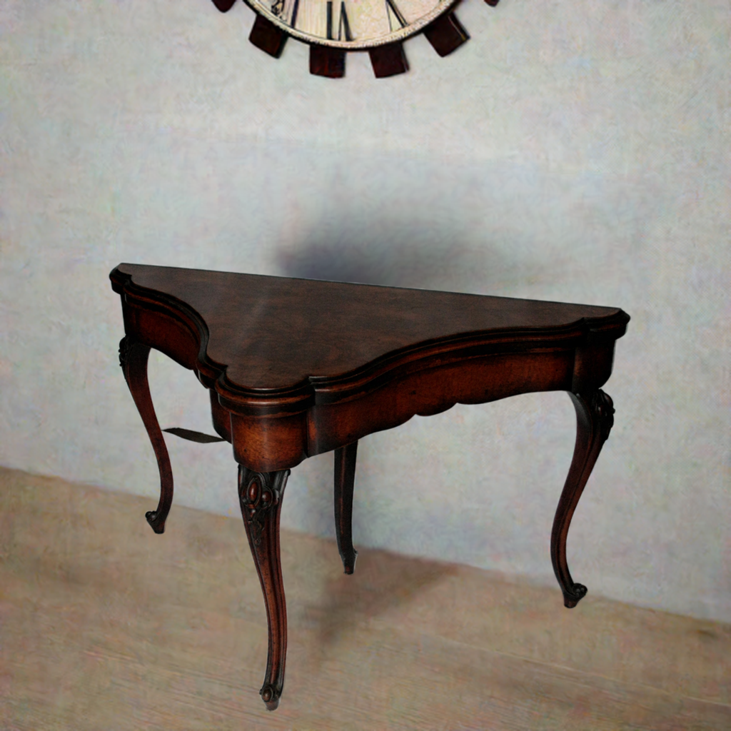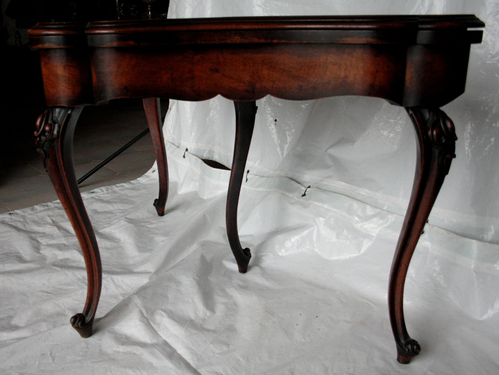 Questo raffinato tavolo da gioco di manifattura inglese tardo settecentesca rappresenta un esemplare di eccezionale qualità ebanistica. Il piano ribaltabile, realizzato in pregiato mogano a fiamma con venature particolarmente pronunciate, rivela all'apertura una superficie di gioco rivestita in baize verde, incorniciata da una bordura in mogano a fiamma meticolosamente lavorata. La struttura si distingue per l'elegante grembiule perimetrale finemente smerlato che si raccorda armoniosamente alle gambe cabriole, caratterizzate da una curvatura sinuosa tipica dello stile dell'epoca. La silhouette complessiva evidenzia proporzioni perfettamente bilanciate, testimonianza della maestria artigianale del periodo georgiano. Le dimensioni del mobile, 123 cm di larghezza per 60 cm di profondità e 76 cm di altezza da chiuso, si trasformano in 123 cm di larghezza per 121 cm di profondità e 75 cm di altezza quando aperto, rendendolo un elemento versatile e funzionale per ambienti di rappresentanza. Un autentico pezzo da collezione che coniuga valore storico, raffinatezza estetica e praticità d'uso.
