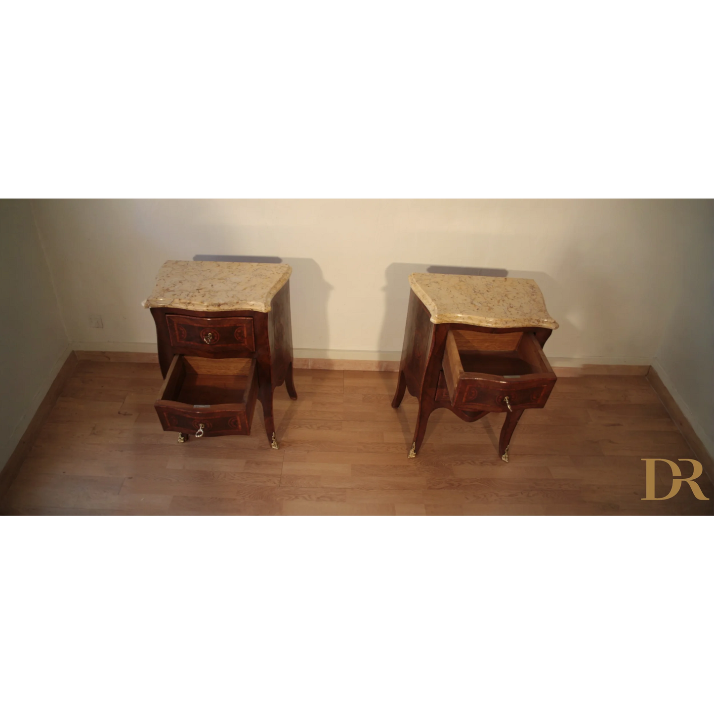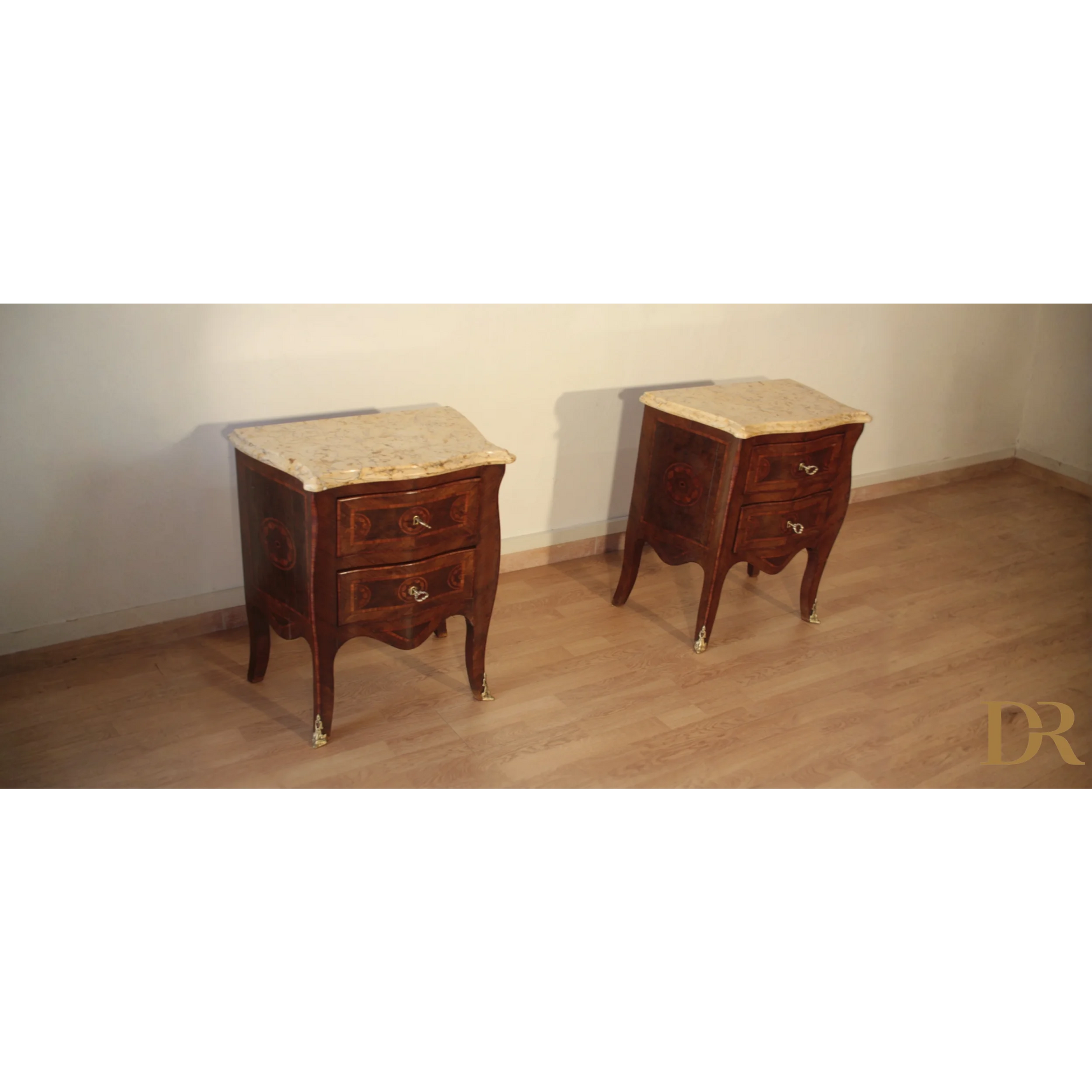 Realizzati in legno massello, questi comodini presentano una struttura raffinata in legno di noce, caratterizzata da lavorazioni ad intarsio che combinano abilmente inserti di radica provenienti da varie essenze pregiate. Questa scelta del bois non solo conferisce un'impareggiabile bellezza visiva che attrae l'attenzione, ma garantisce anche una durevolezza e una resistenza eccezionali, rendendoli perfetti per qualsiasi ambiente domestico e capaci di resistere alla prova del tempo.