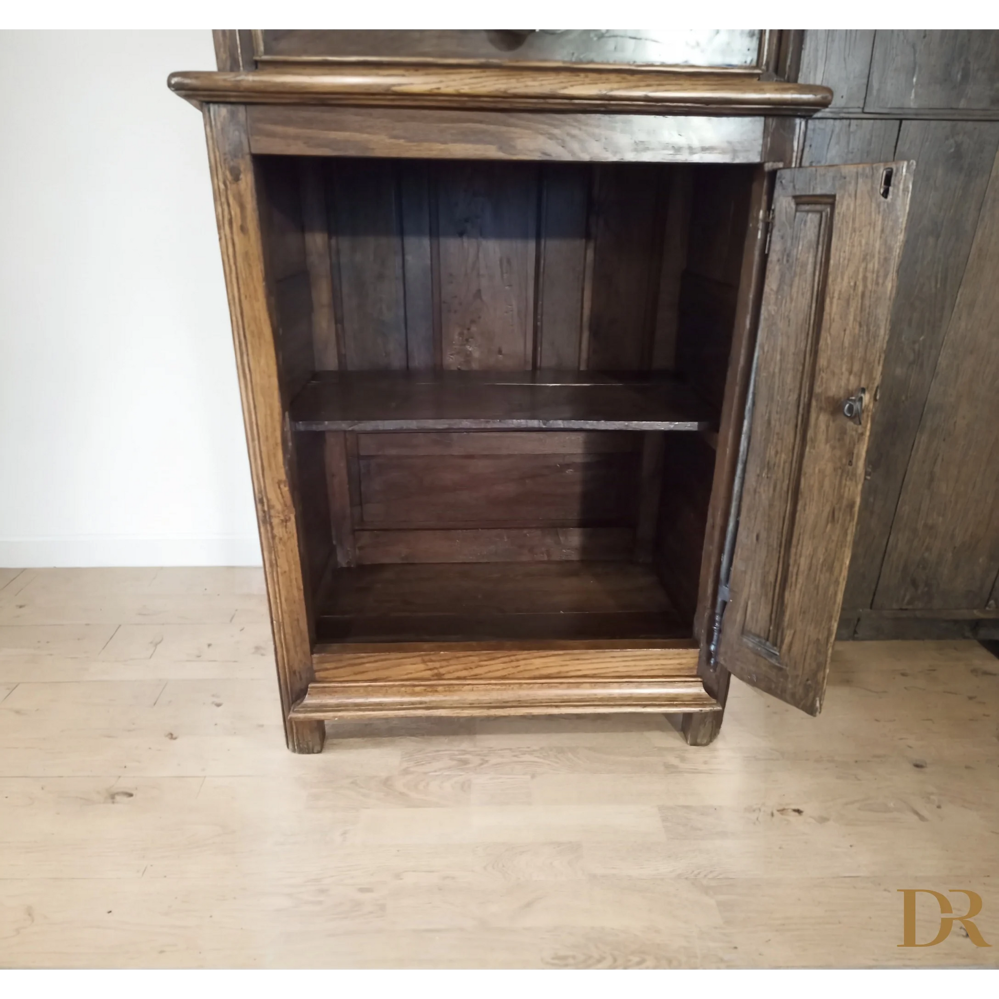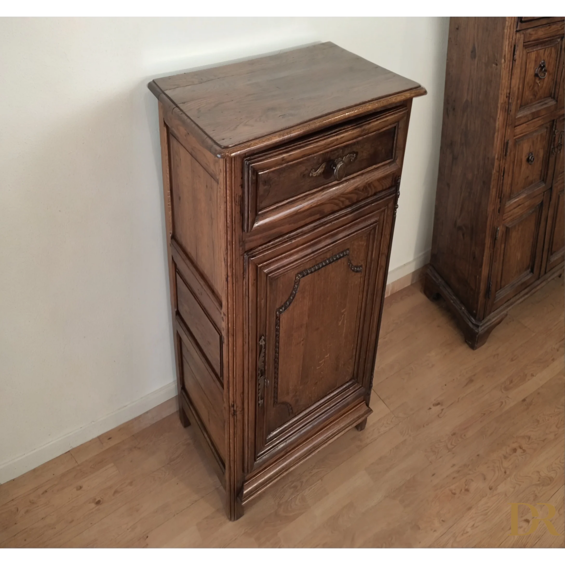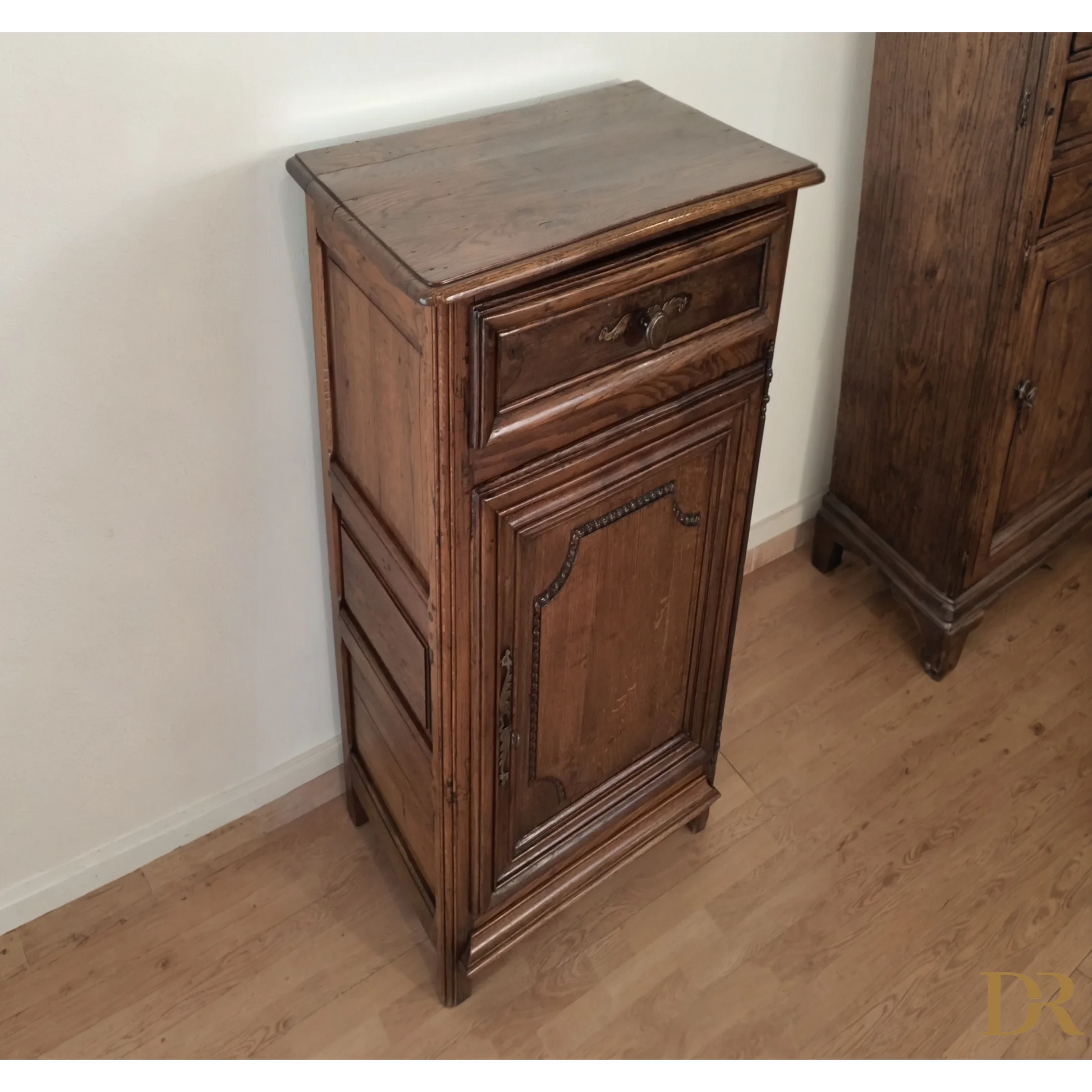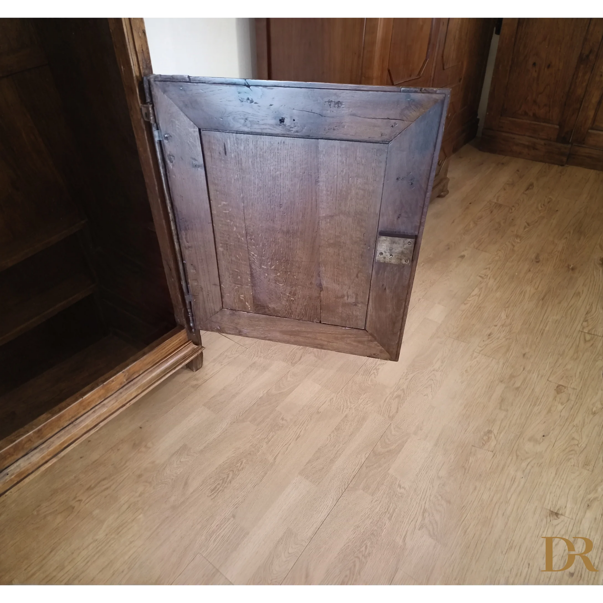 Credenza bassa settecentesca in rovere, un autentico pezzo vintage, caratterizzata da un'anta decorata da una grande cimasa che ne esalta il fascino rustico e la maestria artigianale dell'epoca. Il mobile è sormontato da un cassetto funzionale, ideale per riporre piccoli oggetti e mantenere l'ordine. Si presenta in ottime condizioni di conservazione, frutto di un attento restauro che ne ha mantenuto l'integrità e il valore storico.