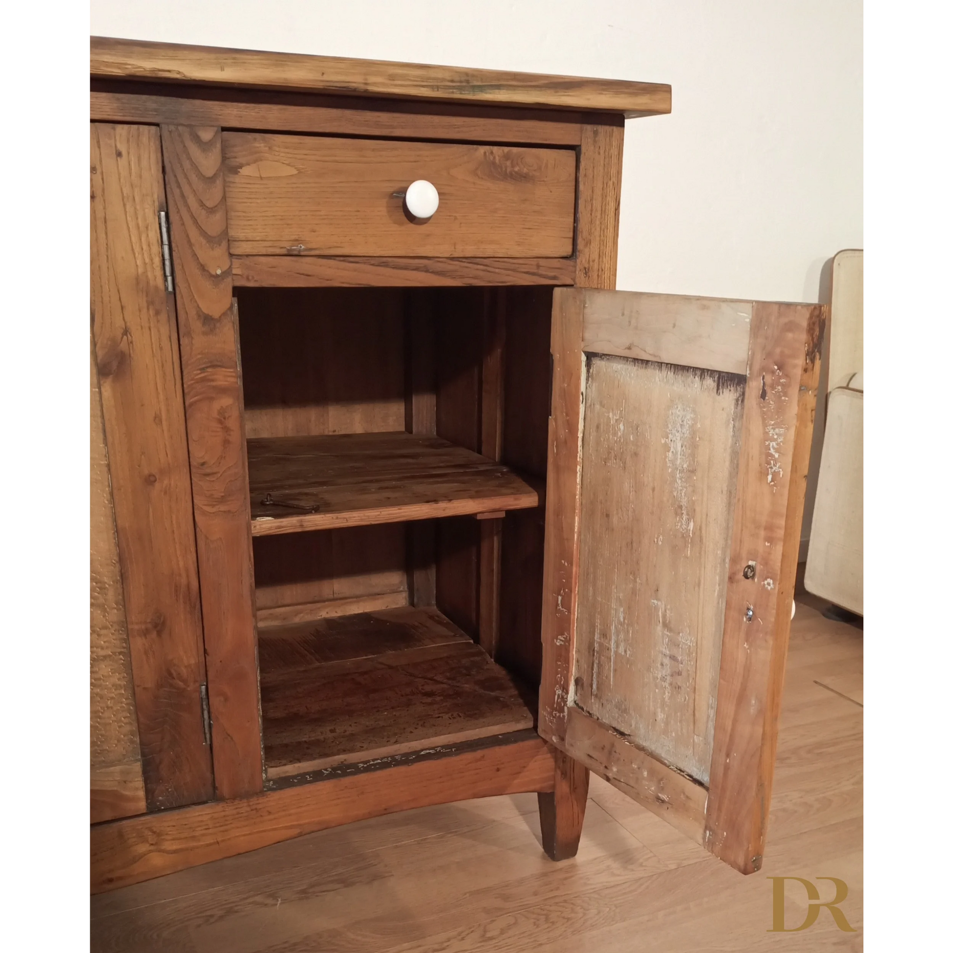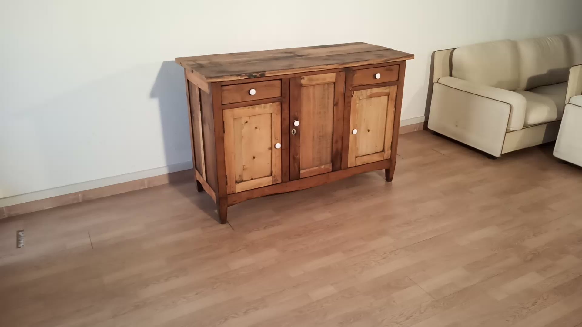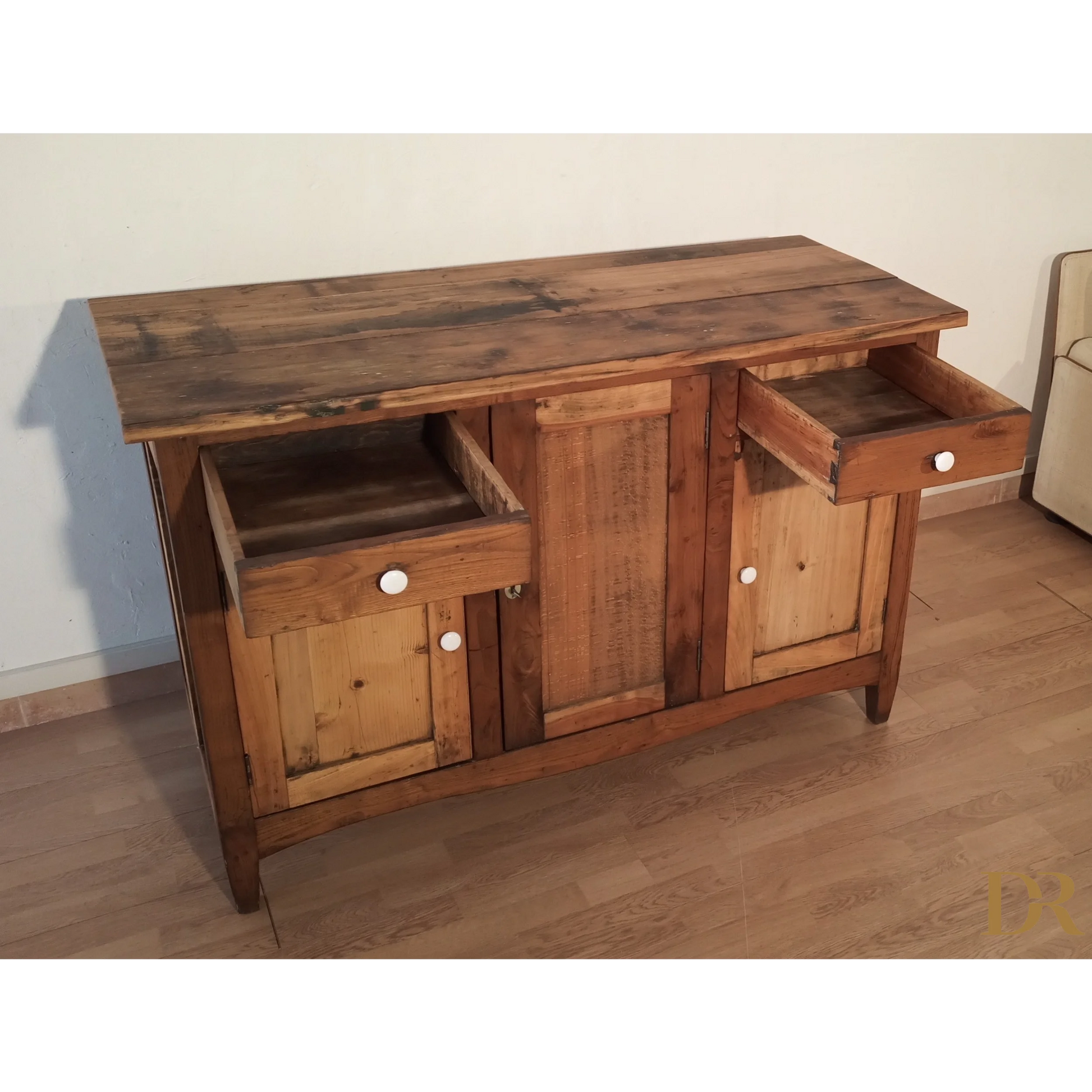 La credenza mostra un'usura generale commisurata all'età, con alcuni piccoli segni di tarlo storico che aggiungono fascino e autenticità al pezzo, senza compromettere la sua struttura. Risulta solida, robusta e priva di danni, dimostrando una qualità costruttiva che ha resistito alla prova del tempo.