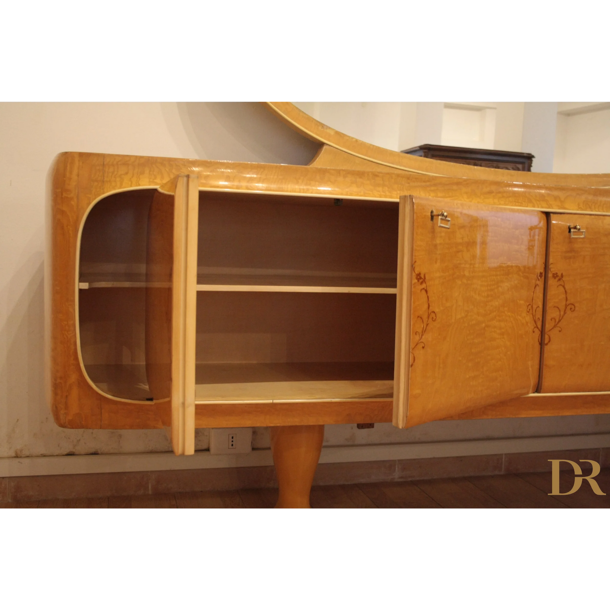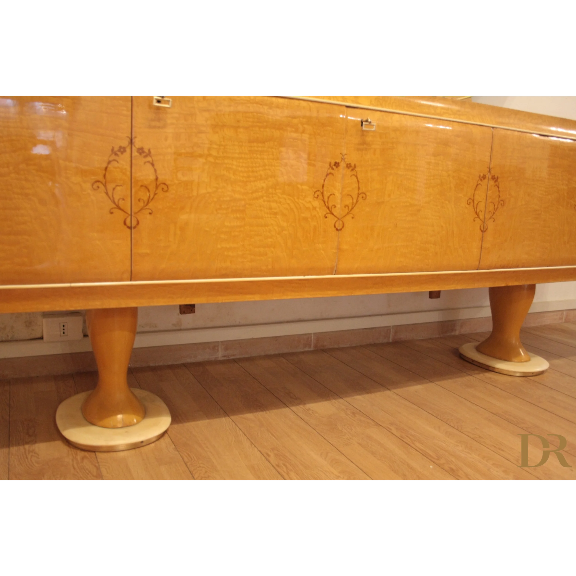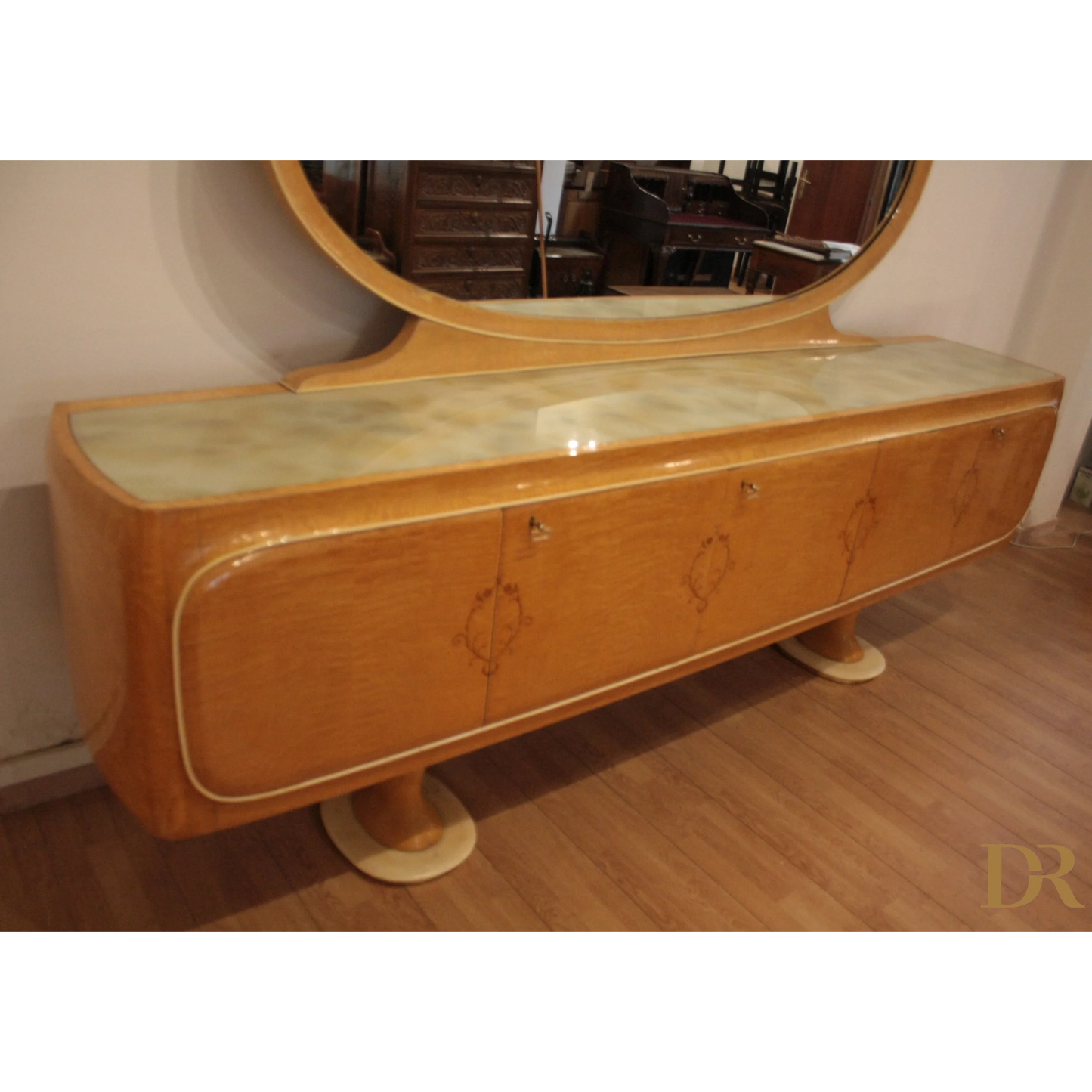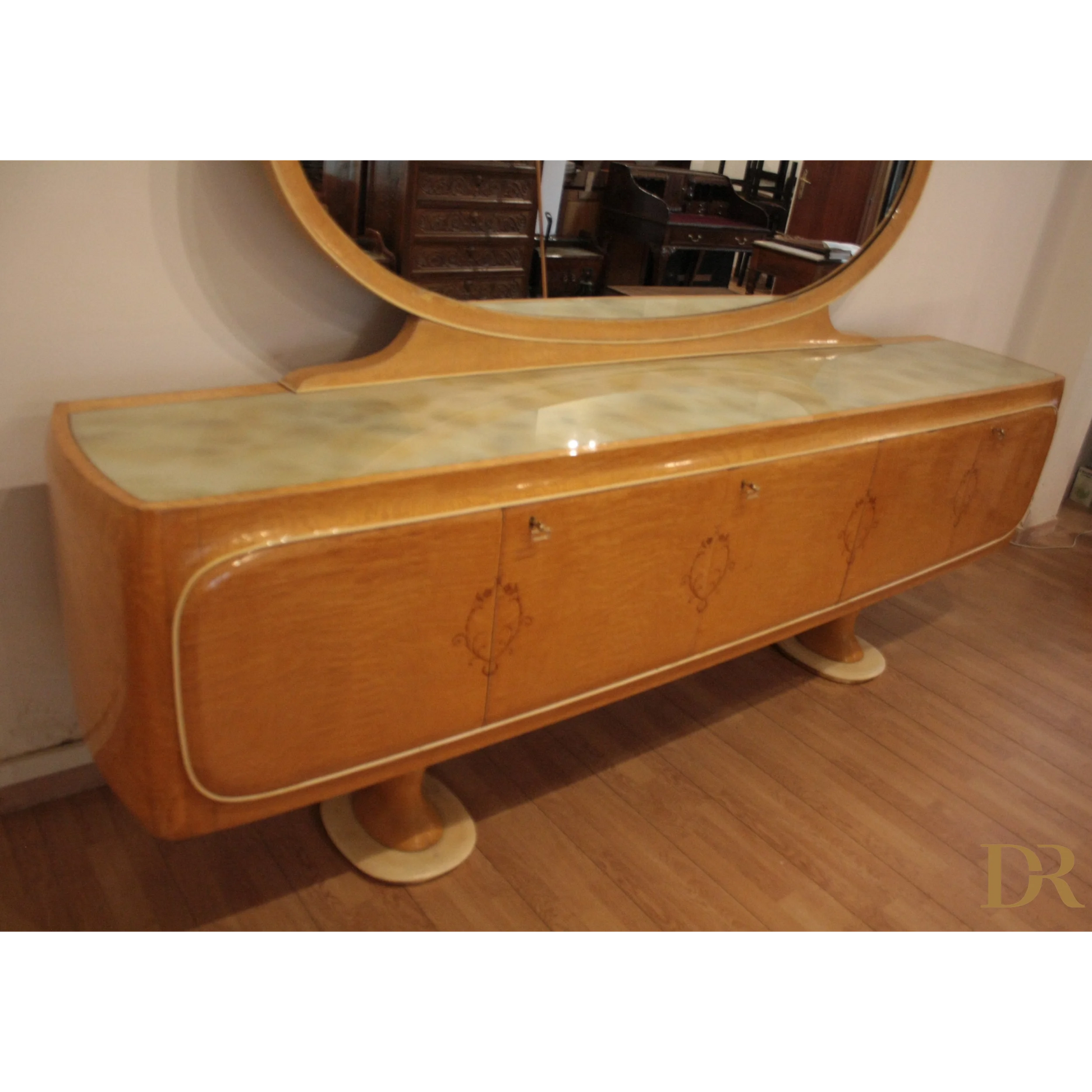 Questa credenza è stata disegnata dal famoso design italiano Vittorio Dassi, Italia 1950. Il mobile è una versione molto particolare della più comune credenza in legno di mogano e intarsi in acero. In questo credenza il legno è chiaro presumibilmente acero e gli intarsi sono in legno scuro. La filettatura bianca che contorna il profilo da un ulteriore tocco di eleganza ad un mobile moderno e attuale. Piano in vetro nella parte superiore della credenza, nella parte centrale due ante laterali e centralmente un anta più piccola con cassettiera interna. Retto da due colonne in legno massello, con basi in marmo e finitura ottone. Grande specchio superiore a impreziosire la credenza.