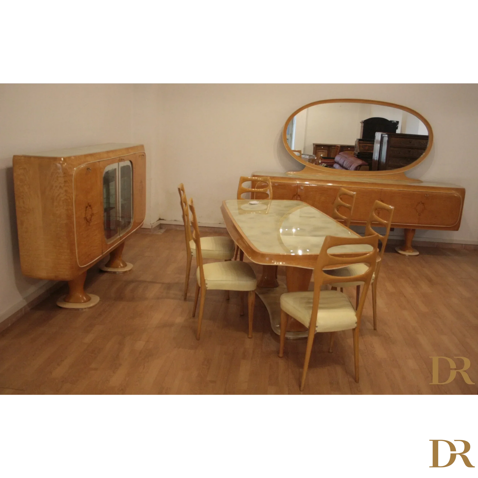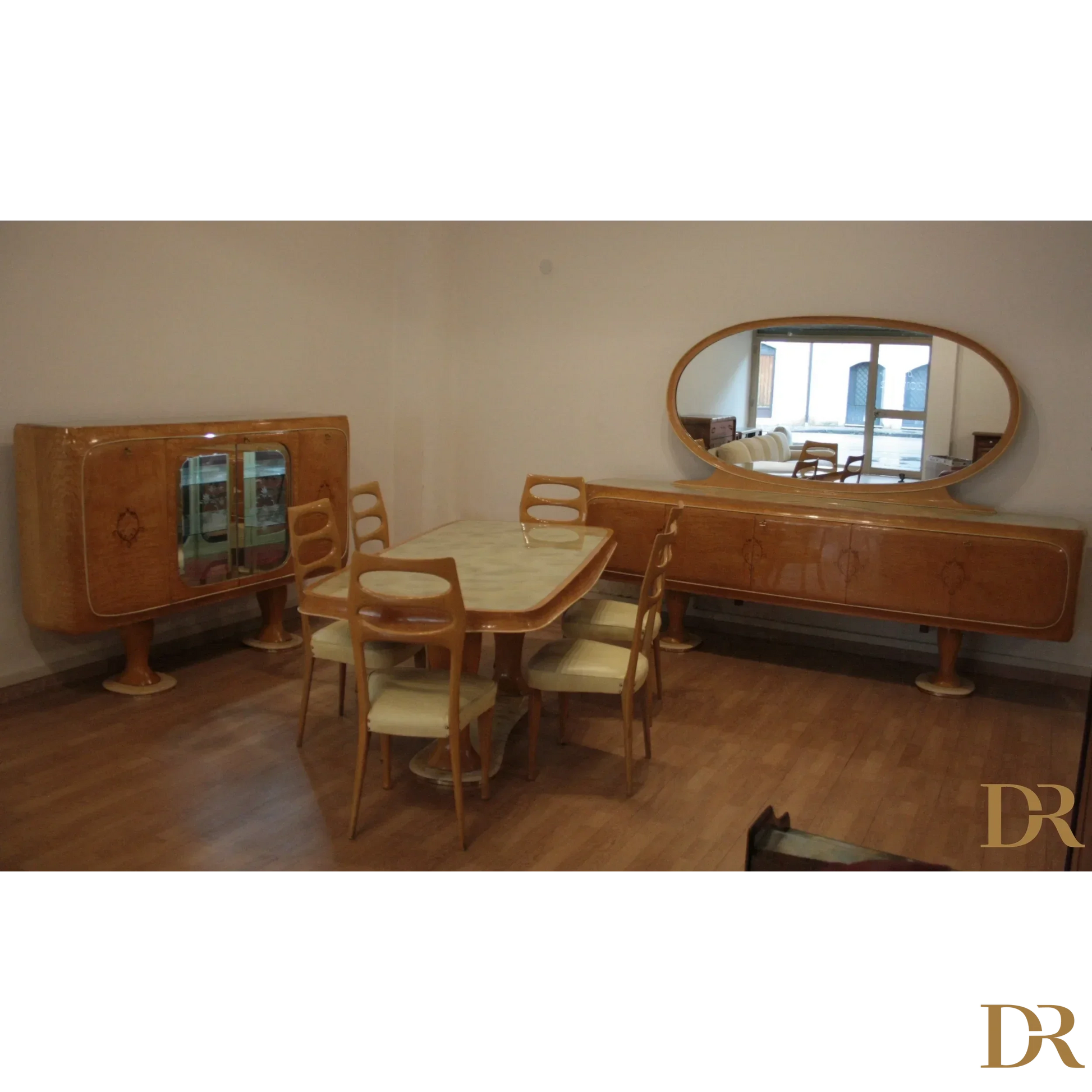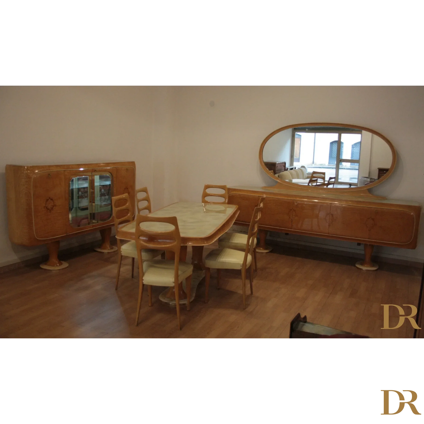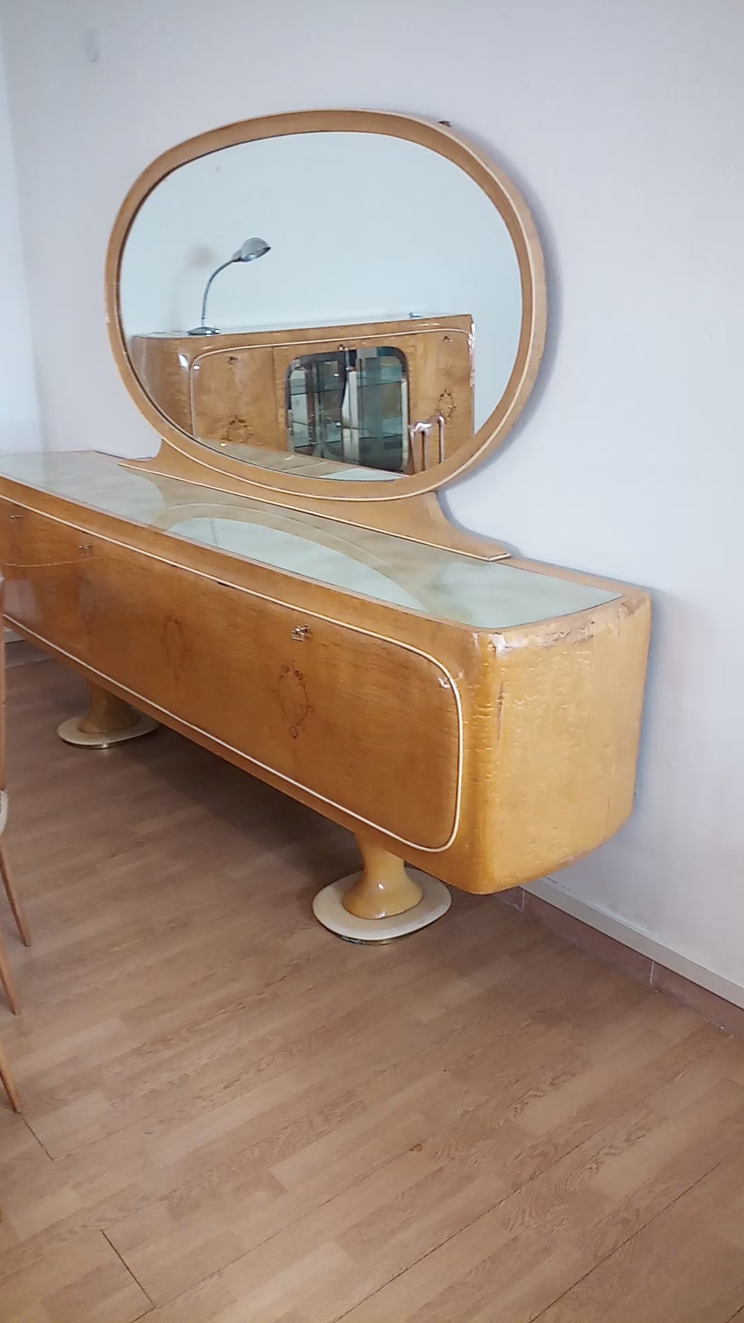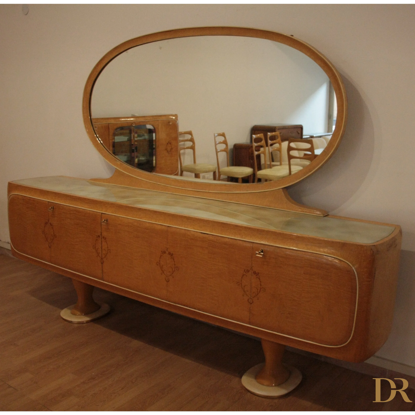 Questa credenza è stata disegnata dal famoso design italiano Vittorio Dassi, Italia 1950. Il mobile è una versione molto particolare della più comune credenza in legno di mogano e intarsi in acero. In questo credenza il legno è chiaro presumibilmente acero e gli intarsi sono in legno scuro. La filettatura bianca che contorna il profilo da un ulteriore tocco di eleganza ad un mobile moderno e attuale. Piano in vetro nella parte superiore della credenza, nella parte centrale due ante laterali e centralmente un anta più piccola con cassettiera interna. Retto da due colonne in legno massello, con basi in marmo e finitura ottone. Grande specchio superiore a impreziosire la credenza.