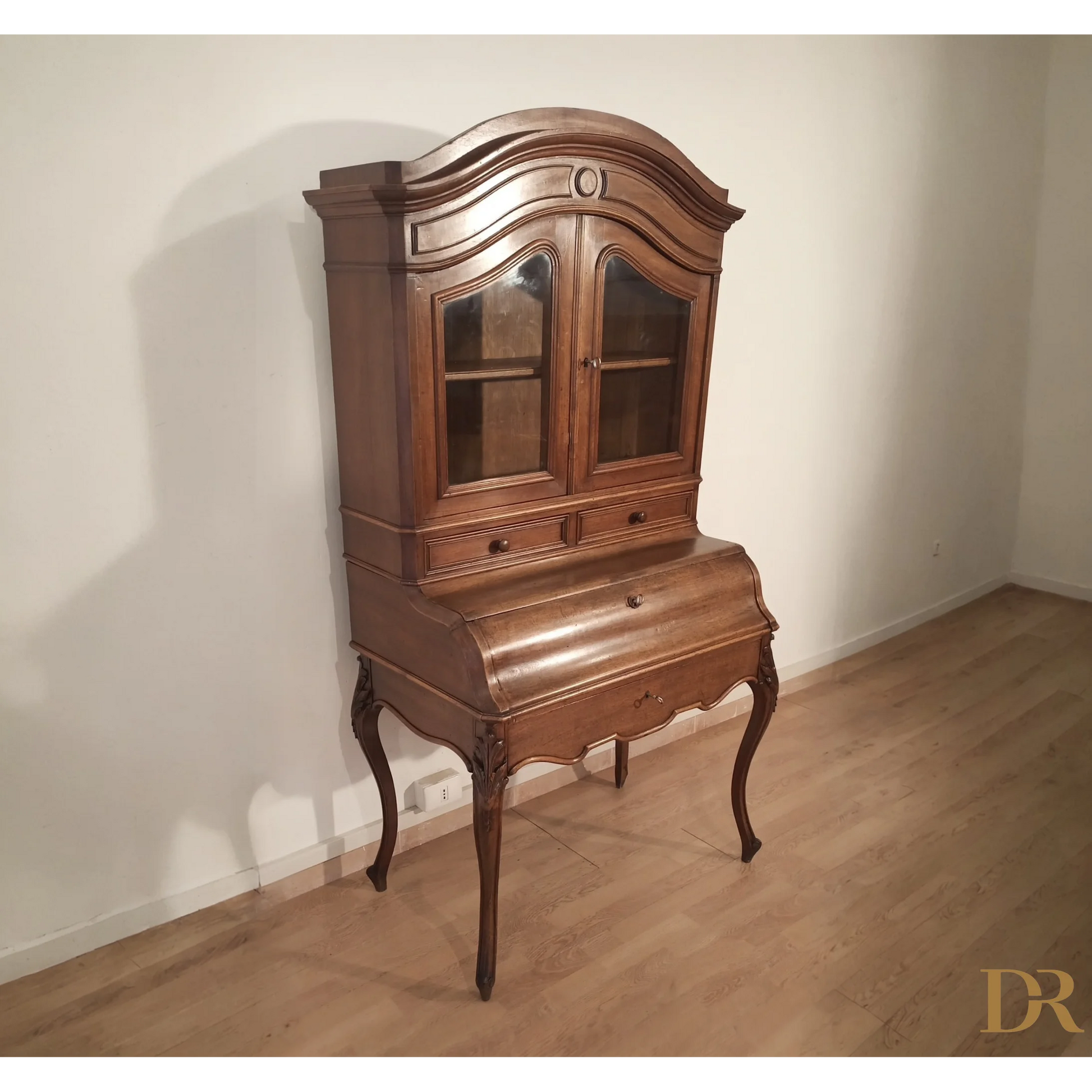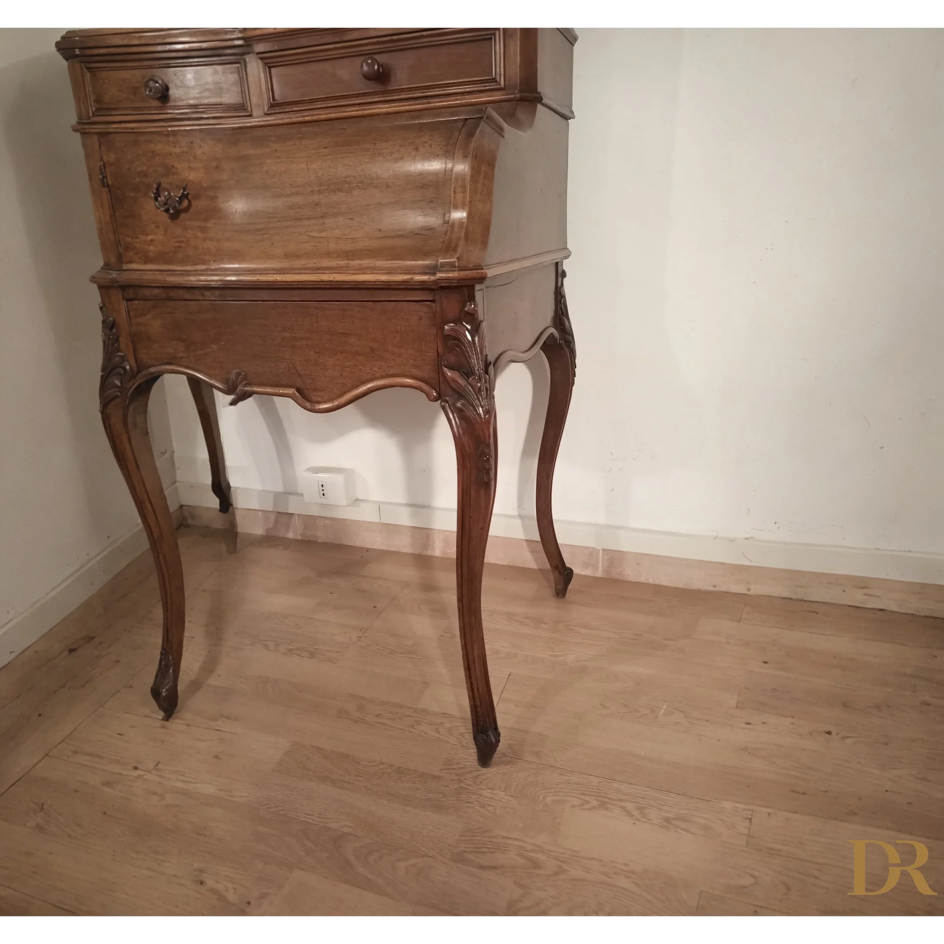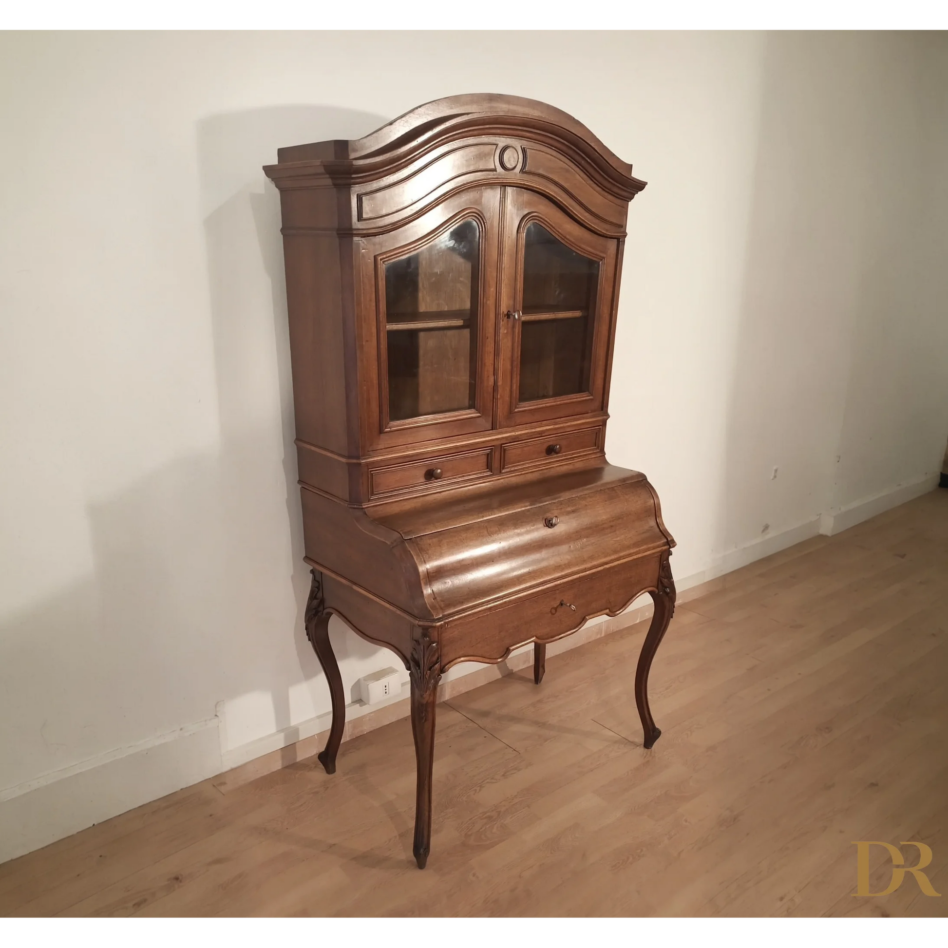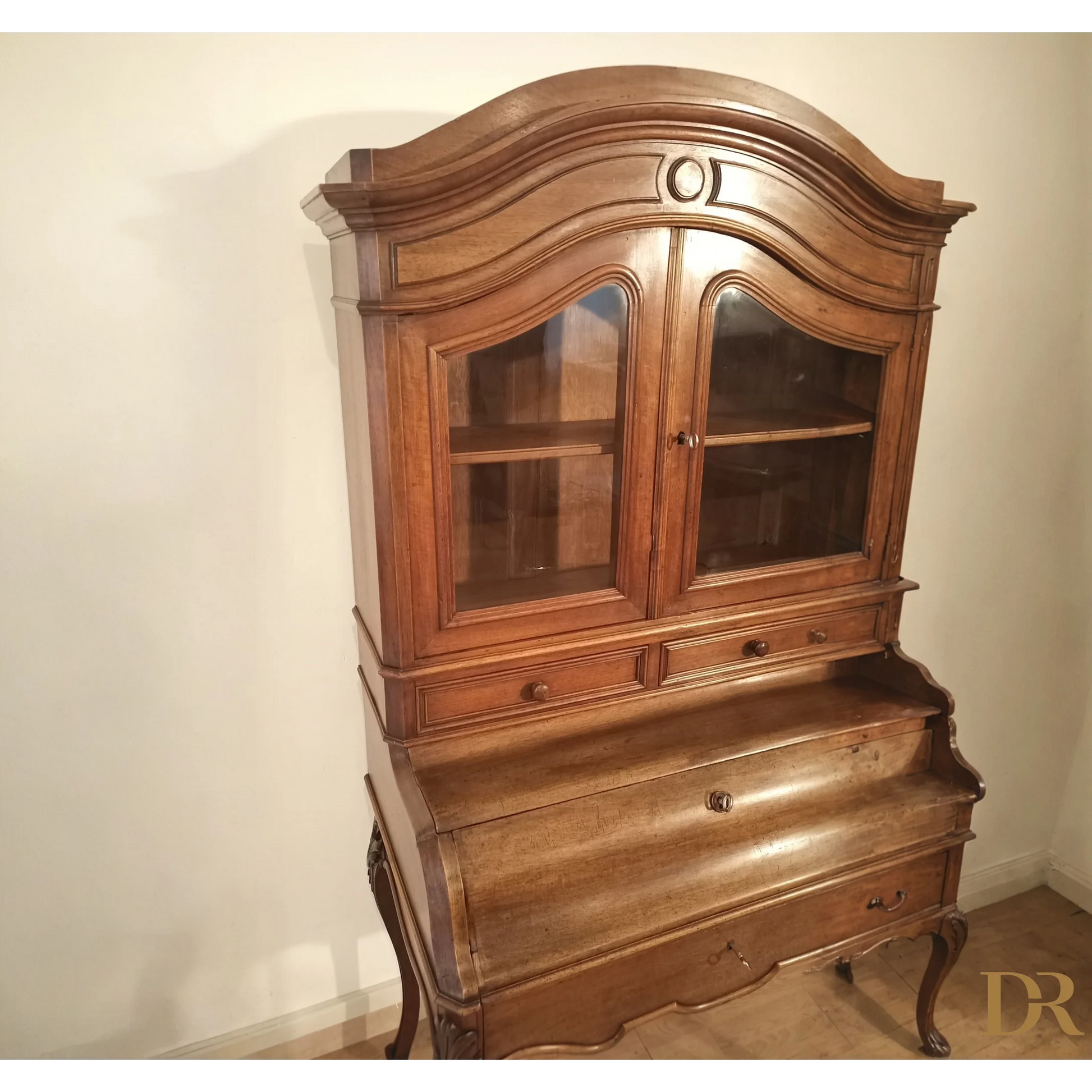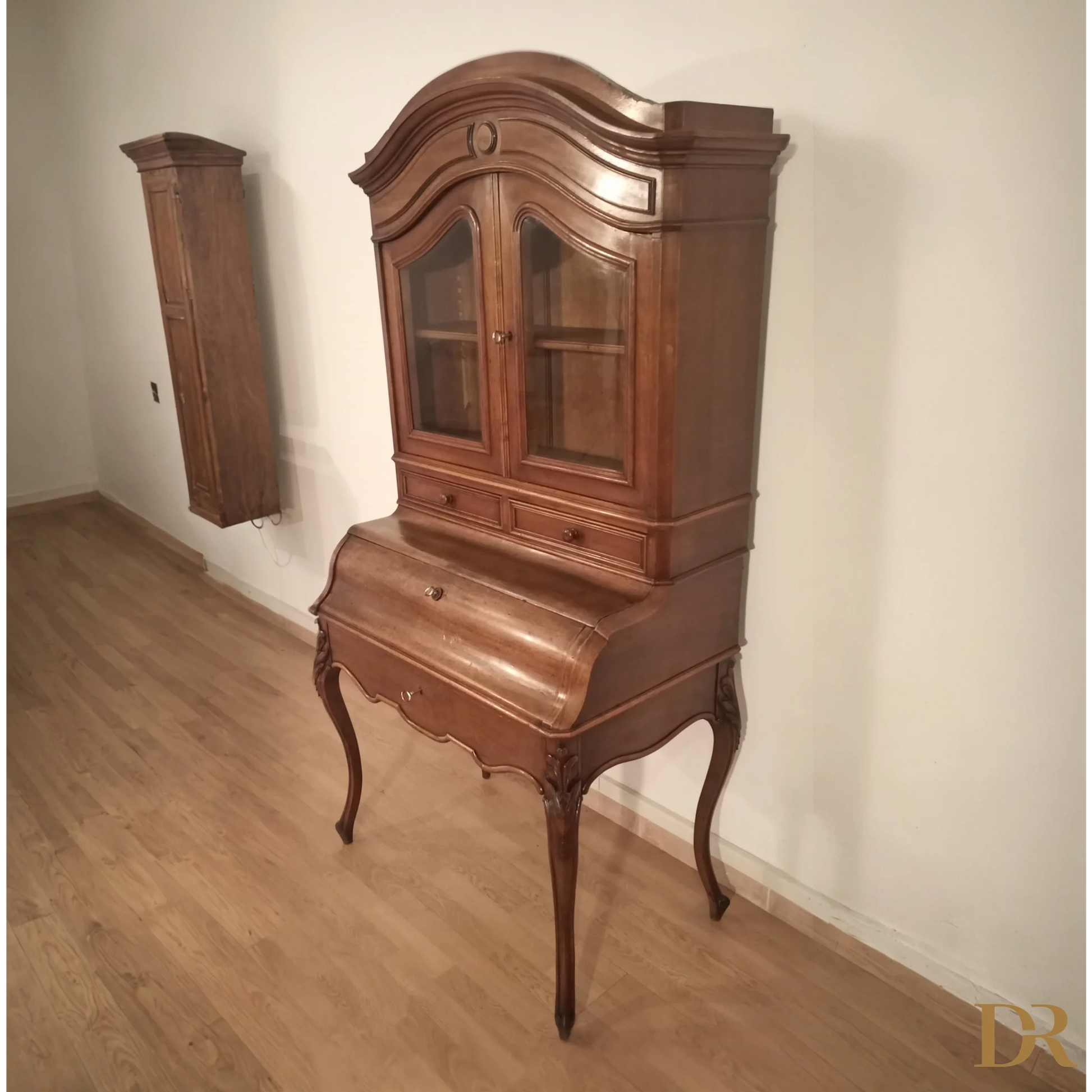 Mobile in due corpi, costituito da un elegante scrittoio a ribalta che include cassetti nella parte inferiore e una raffinata credenza con due cassetti nella parte superiore. Questo pezzo è realizzato in noce massello, un legno pregiato che conferisce robustezza e un aspetto caloroso. Gli interni sono in rovere massello, noto per la sua durabilità e bellezza, mentre l'acero viene utilizzato strategicamente per lo scompartimento interno del scrittoio a ribalta, offrendo un contrasto interessante e funzionale.