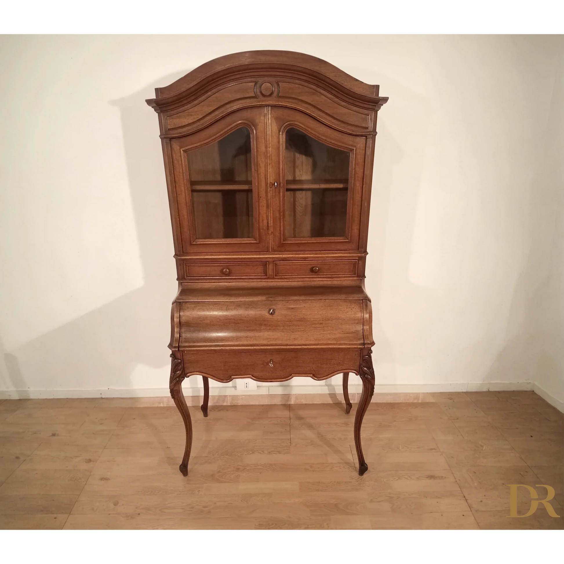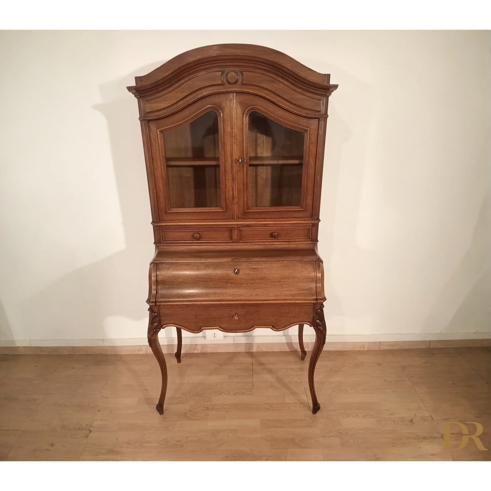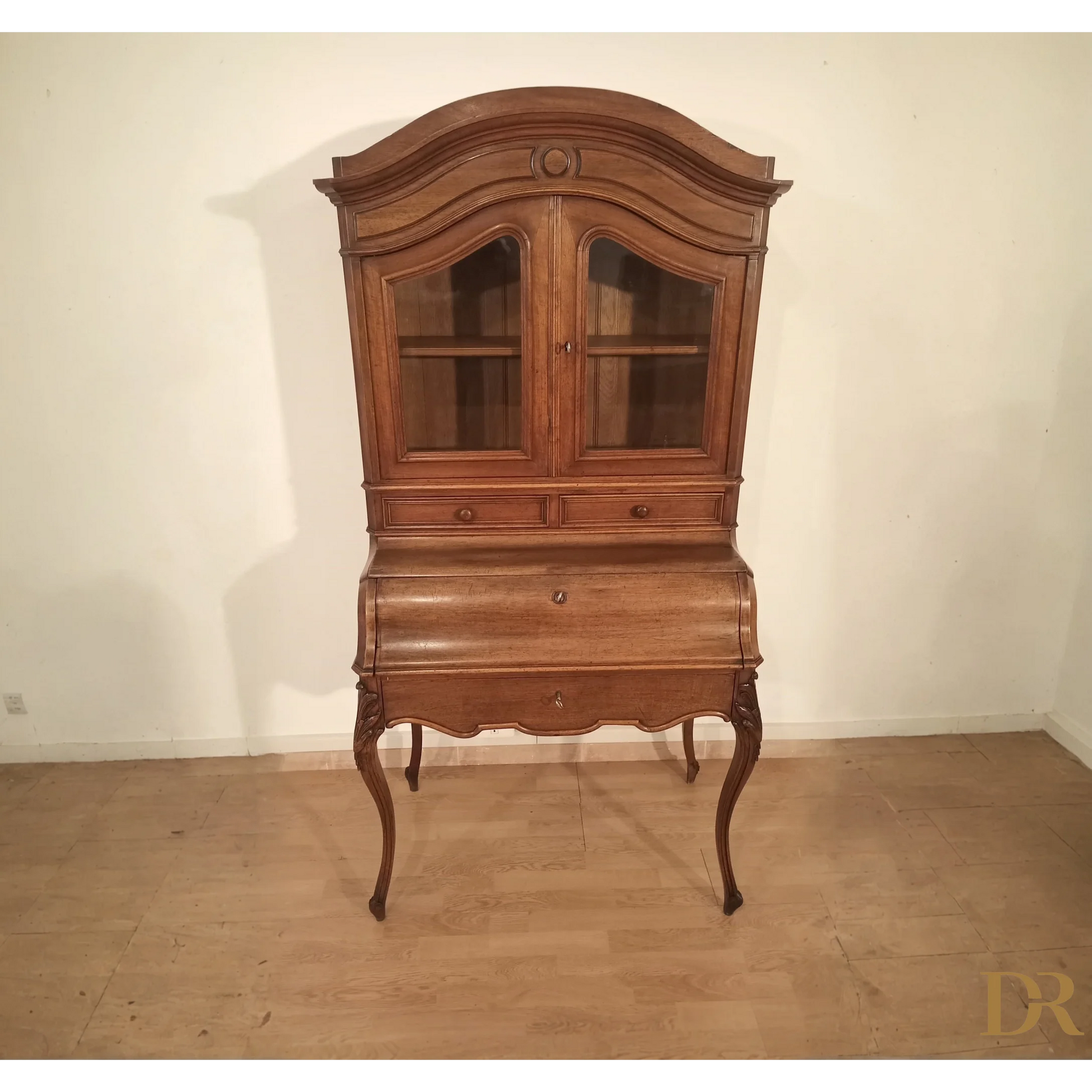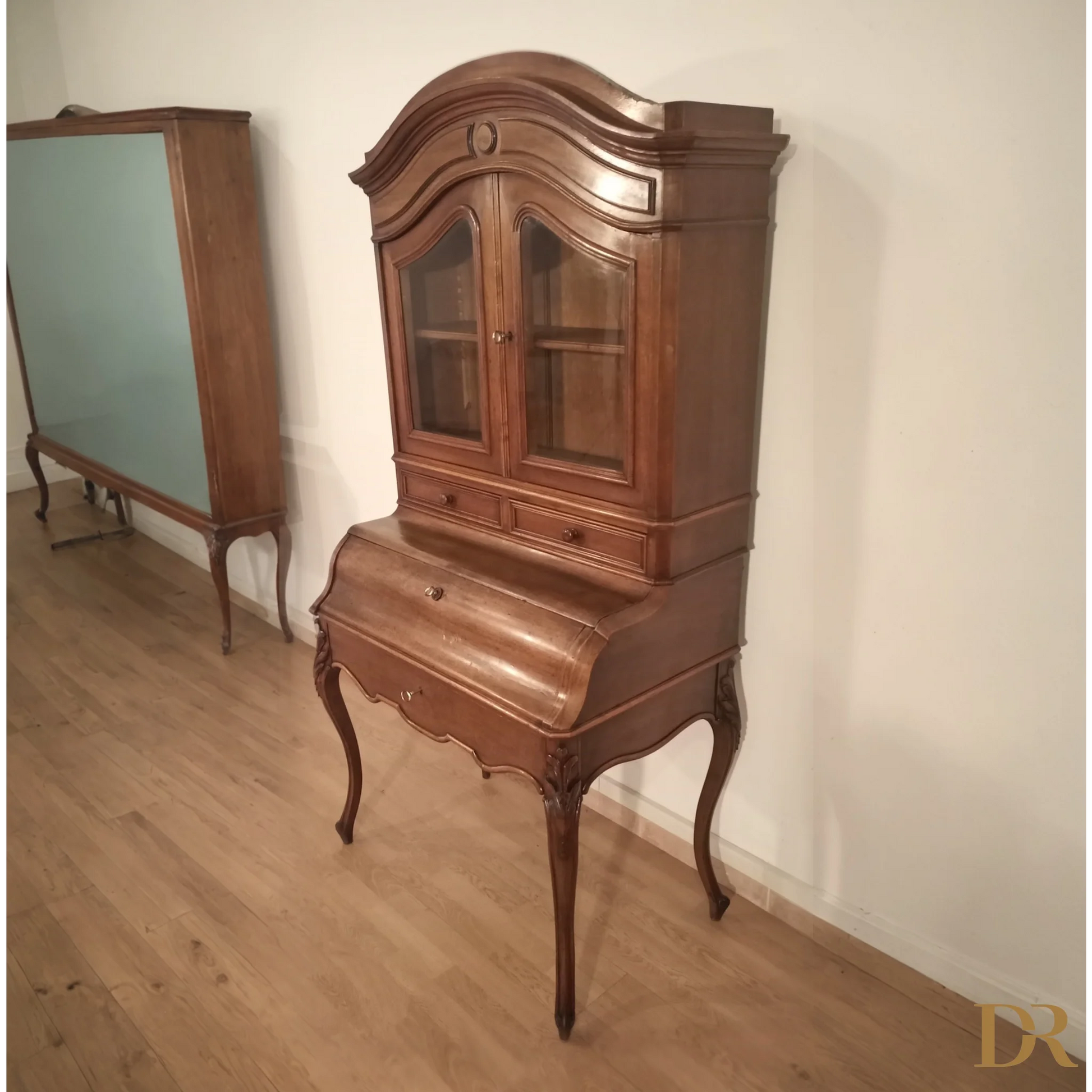 Mobile in due corpi, costituito da un elegante scrittoio a ribalta che include cassetti nella parte inferiore e una raffinata credenza con due cassetti nella parte superiore. Questo pezzo è realizzato in noce massello, un legno pregiato che conferisce robustezza e un aspetto caloroso. Gli interni sono in rovere massello, noto per la sua durabilità e bellezza, mentre l'acero viene utilizzato strategicamente per lo scompartimento interno del scrittoio a ribalta, offrendo un contrasto interessante e funzionale.
