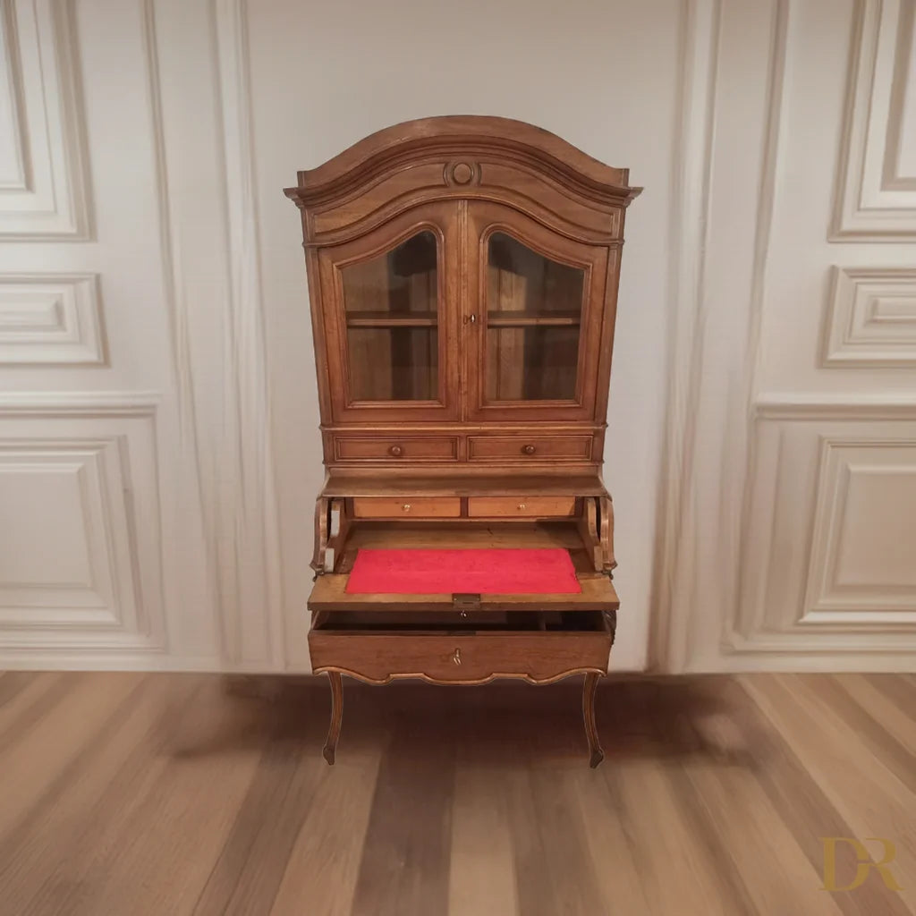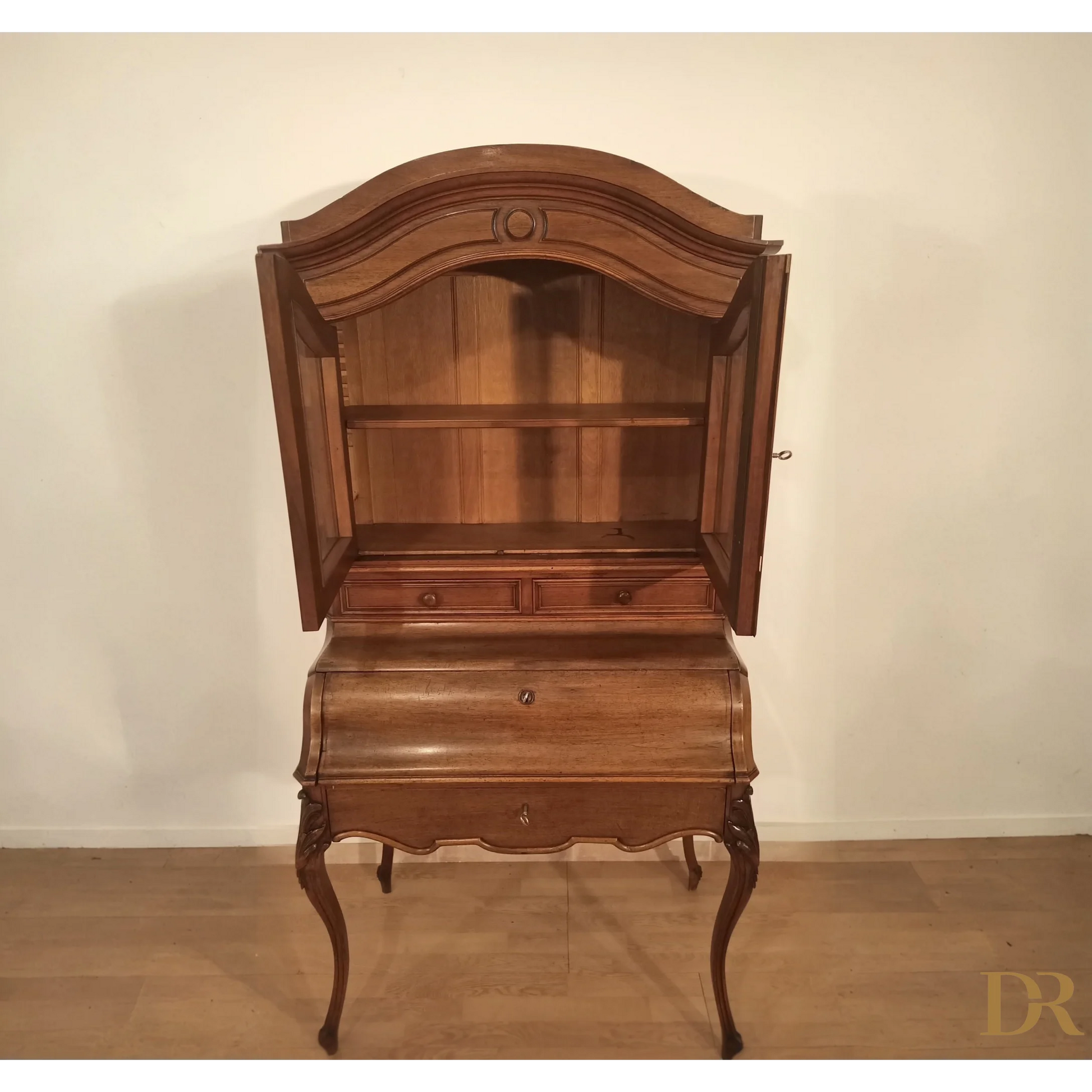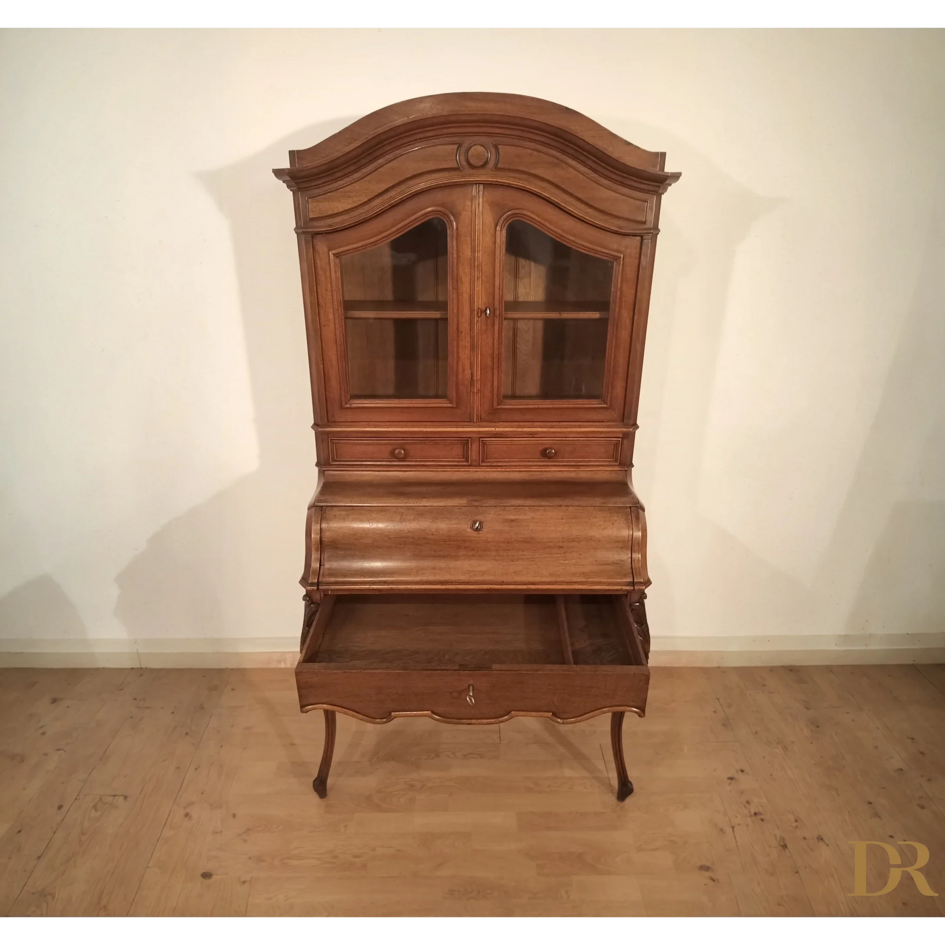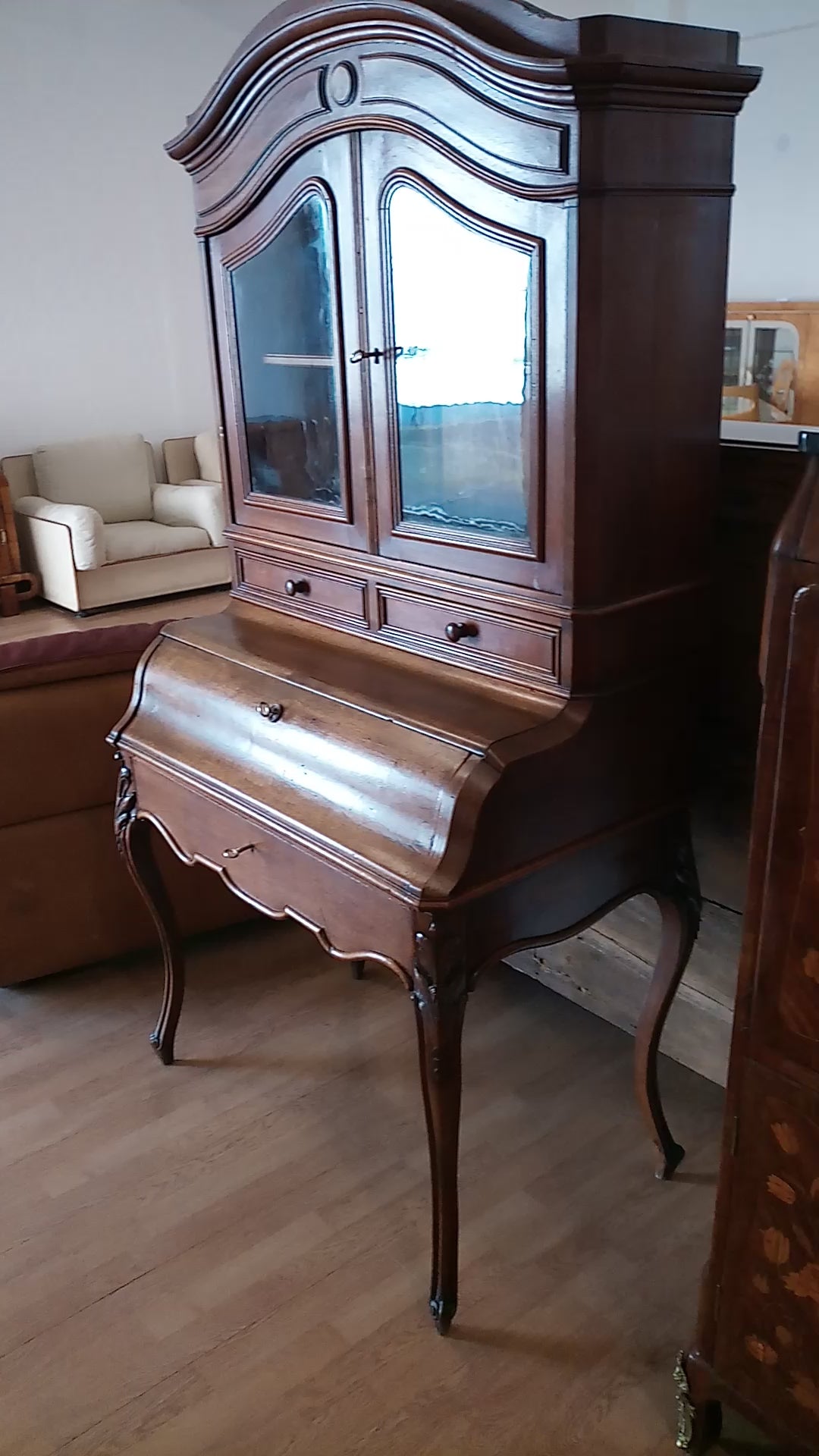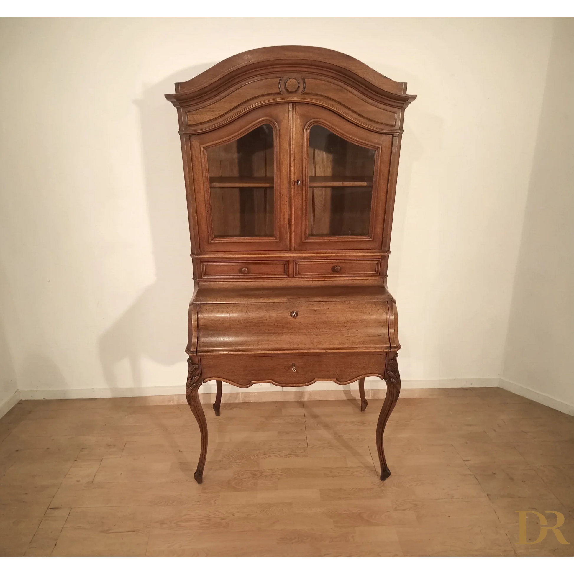 Mobile in due corpi, costituito da un elegante scrittoio a ribalta che include cassetti nella parte inferiore e una raffinata credenza con due cassetti nella parte superiore. Questo pezzo è realizzato in noce massello, un legno pregiato che conferisce robustezza e un aspetto caloroso. Gli interni sono in rovere massello, noto per la sua durabilità e bellezza, mentre l'acero viene utilizzato strategicamente per lo scompartimento interno del scrittoio a ribalta, offrendo un contrasto interessante e funzionale.