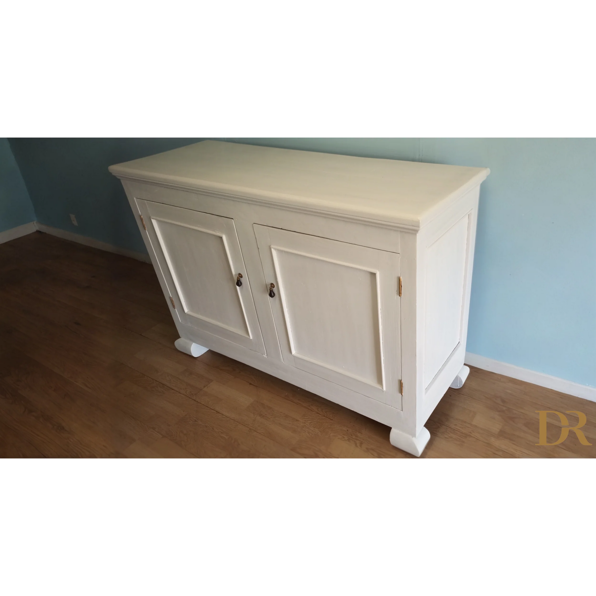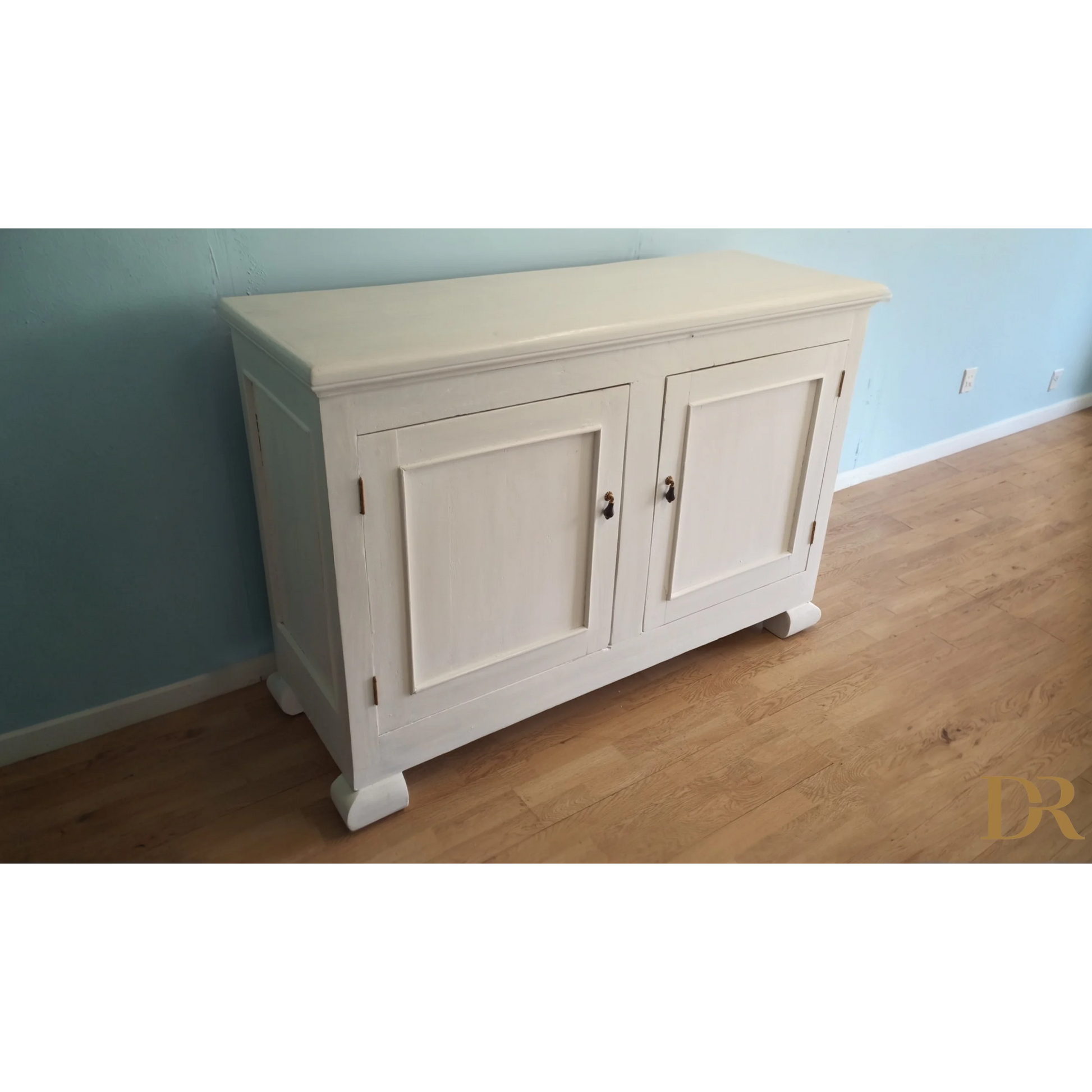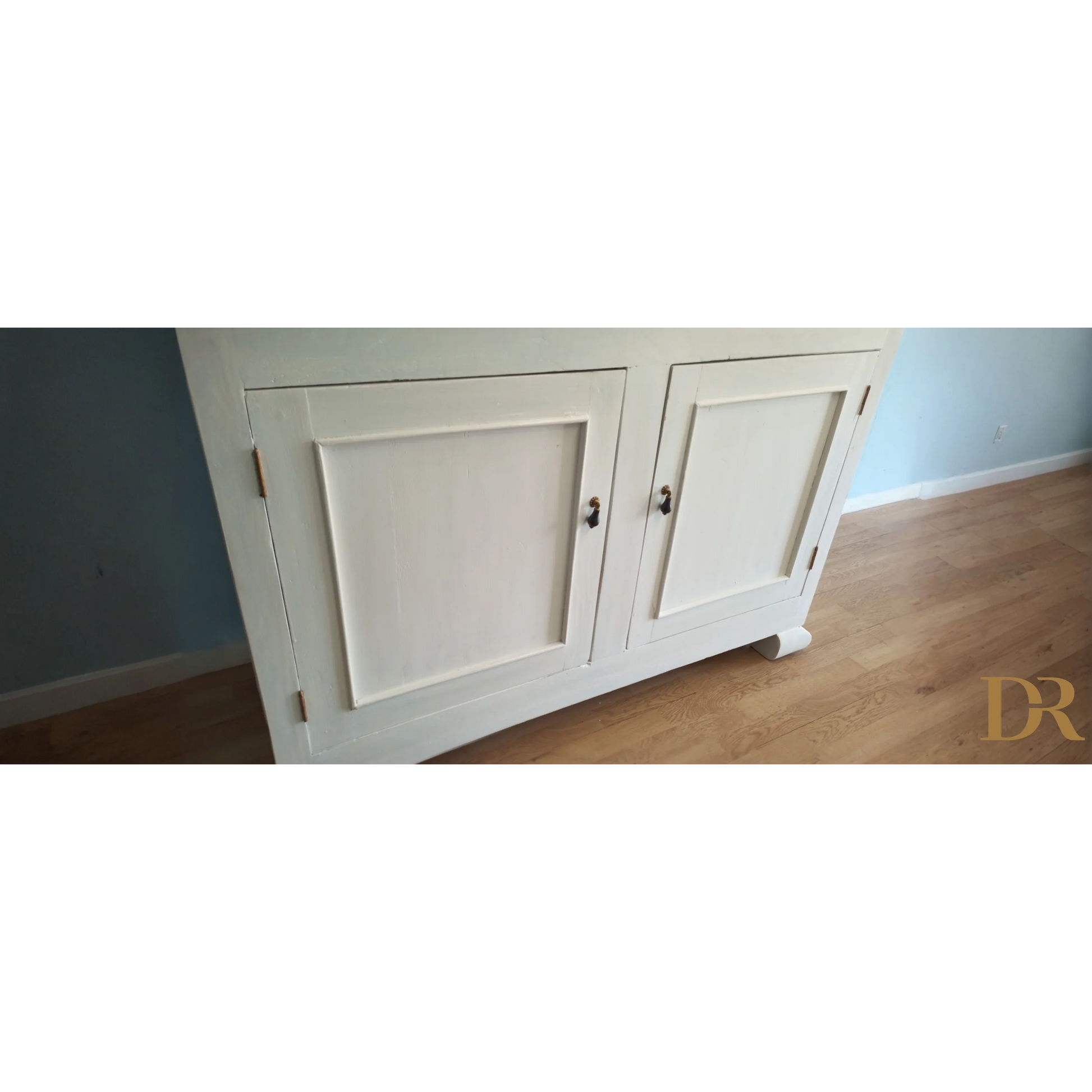 Questa credenza italiana realizzata nella prima metà del Novecento in Italia meridionale è un perfetto esempio di design provenzale shabby, portando con sé l'eleganza di un'epoca passata. La superficie è stata sapientemente dipinta e anticata in un delicato colore bianco avorio, il che le conferisce un'aura vintage e la rende adatta a vari stili d'arredo, dall'accogliente rustico al raffinato contemporaneo.