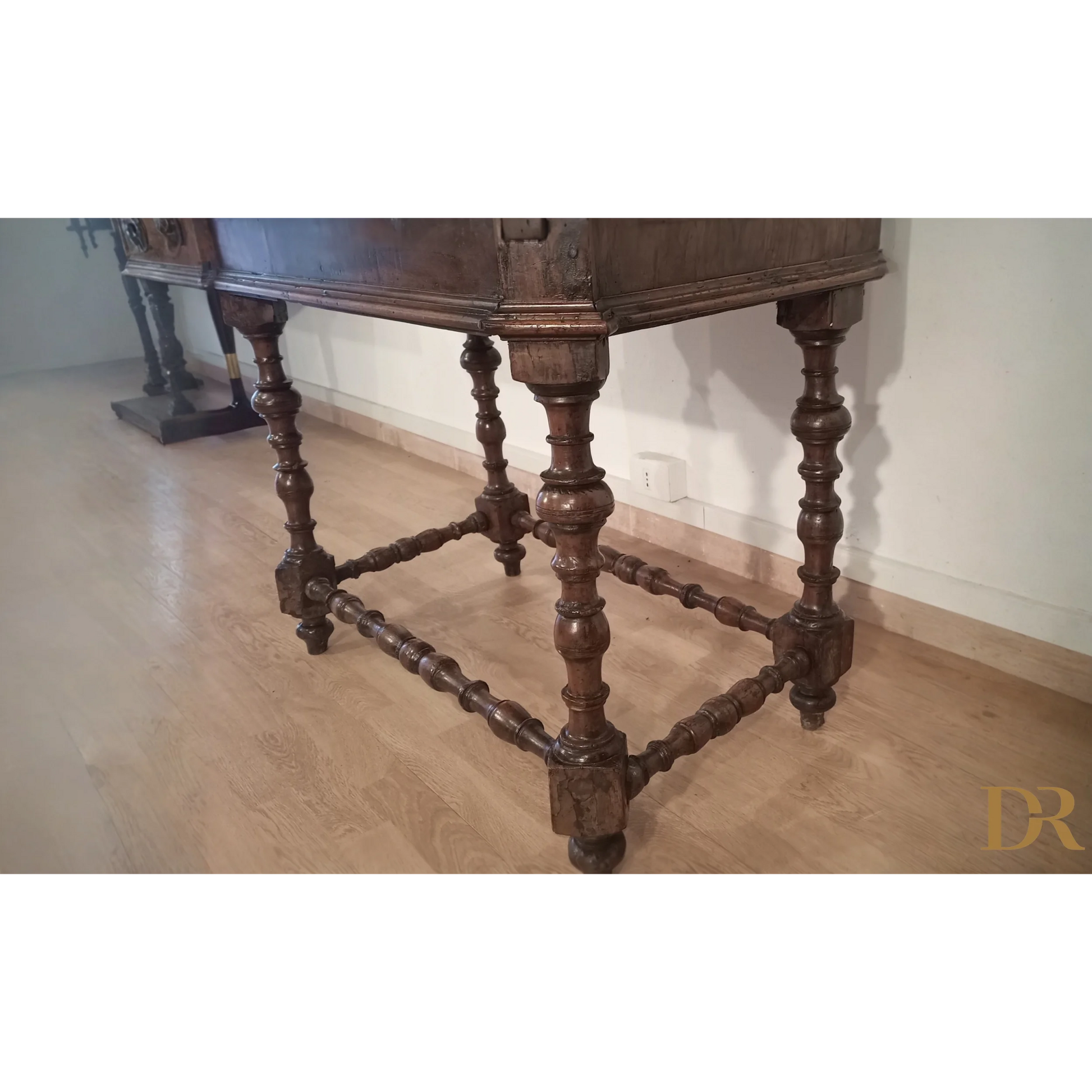 Questo scrittoio a ribalta rappresenta un raro esempio di mobilio proveniente dal XVII-XVIII secolo, un periodo caratterizzato da una ricca produzione artigianale in Italia. Questo pezzo è particolarmente significativo non solo per il suo stile elegante e sofisticato, tipico del ribalta XVIII secolo, ma anche per la sua funzionalità, che lo rende una scrivania versatile in grado di adattarsi a diversi ambienti e usi. Le imperfezioni e i segni del tempo sono testimonianze dell'uso passato e contribuiscono al suo fascino, rivelando storie e momenti vissuti attraverso i decenni. Ogni graffiatura e usura racconta la storia di chi l'ha utilizzata, rendendo questo mobile non solo un oggetto d'arredo, ma anche un pezzo di storia.
