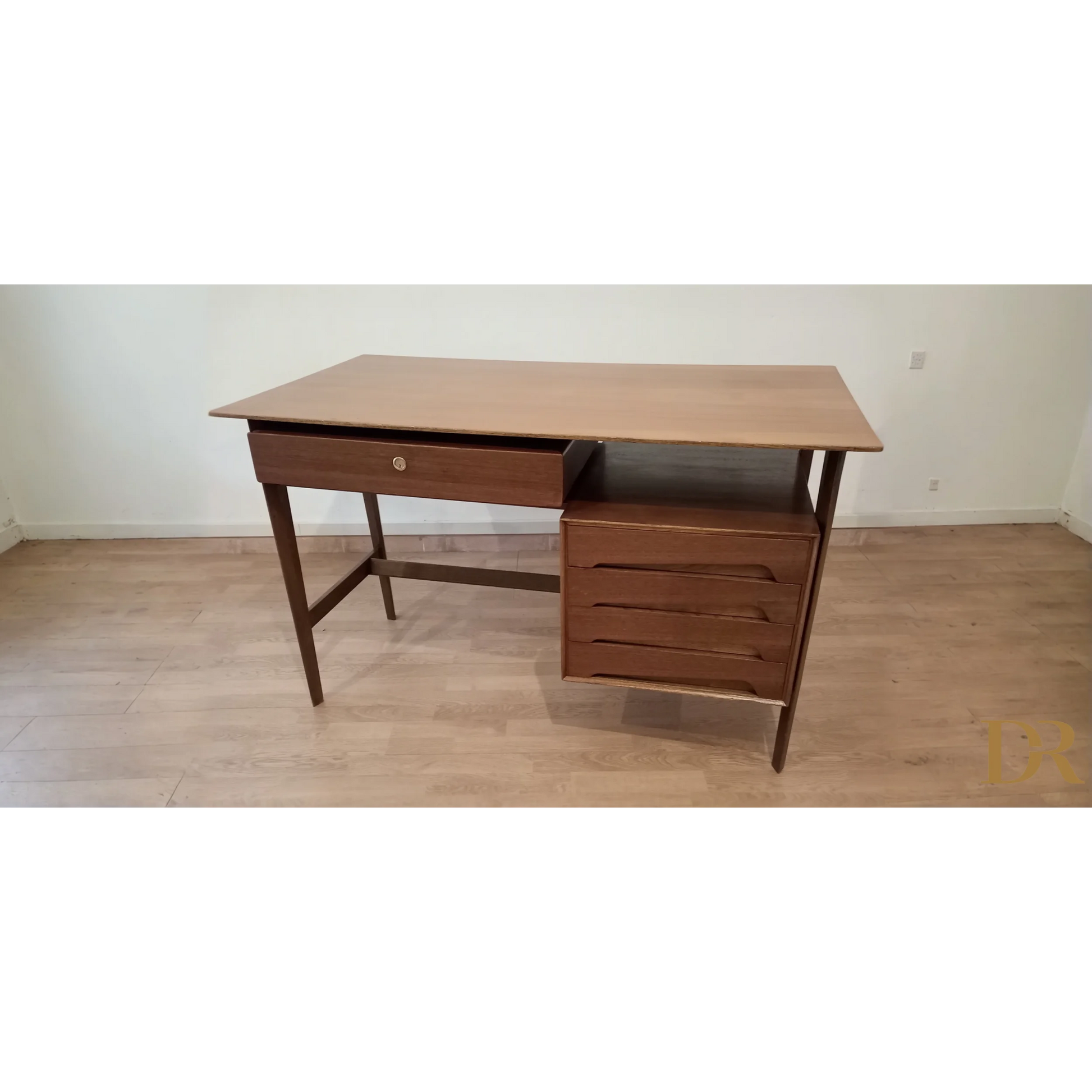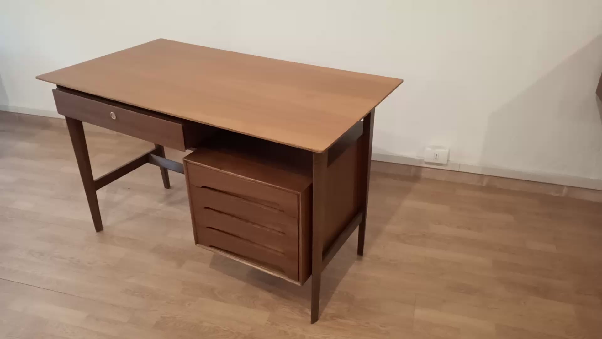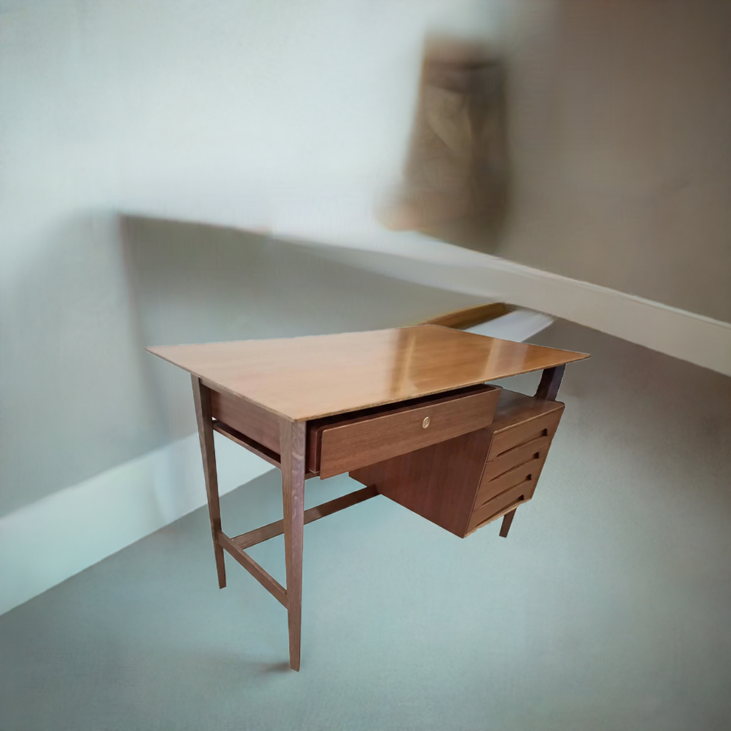 Pregiato Scrittoio in Teak, disegnato dall'acclamato designer Edmondo Palutari per il noto marchio Vittorio Dassi, realizzato tra la fine degli anni '50 e l'inizio dei '60. Questo elegante scrittoio si distingue per il suo design raffinato e funzionale, rappresentando un perfetto equilibrio tra estetica e praticità. La presenza di un pratico cassetto sotto il piano di lavoro è particolarmente utile per riporre documenti, cancelleria e materiali vari, contribuendo a mantenere un ambiente di lavoro ordinato. Inoltre, la cassettiera laterale è equipaggiata con quattro cassetti spaziosi, offrendo ampio spazio per una gestione ottimale dell'organizzazione e della conservazione degli accessori da studio. La scrivania è proposta nelle condizioni originali, con piccoli segni del tempo che non solo testimoniano la sua storia, ma aggiungono anche un carattere unico e autentico al pezzo. Questa combinazione di funzionalità e design d'autore rende lo scrittoio di Edmondo Palutari un elemento d'arredo prezioso e distintivo, ideale per arricchire qualsiasi ambiente di lavoro o studio con un tocco di classe senza tempo.