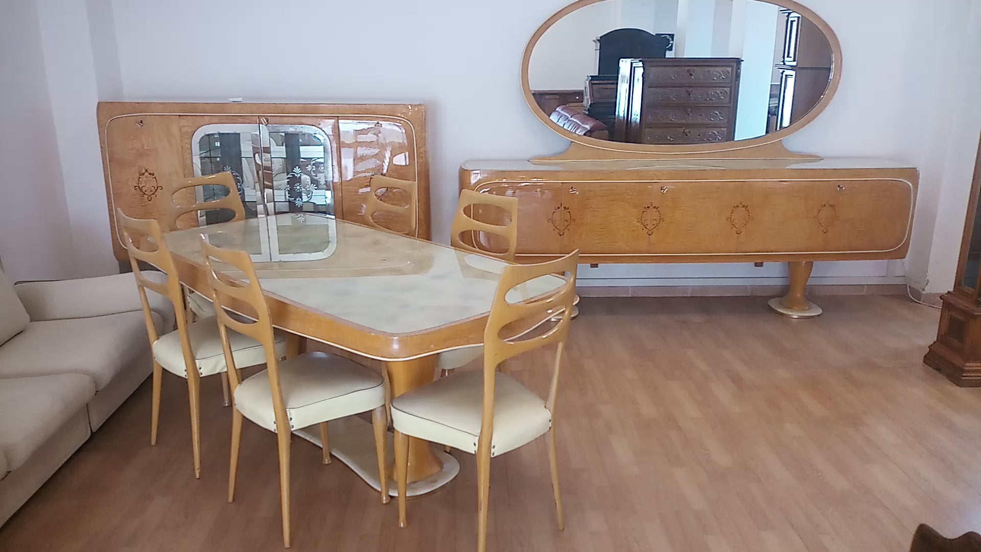 Sei sedie da pranzo disegnate dal famoso architetto italiano Vittorio Dassi, sedie massello e rivestimento originale in ecopelle, inserti in ottone. In ottime condizioni.