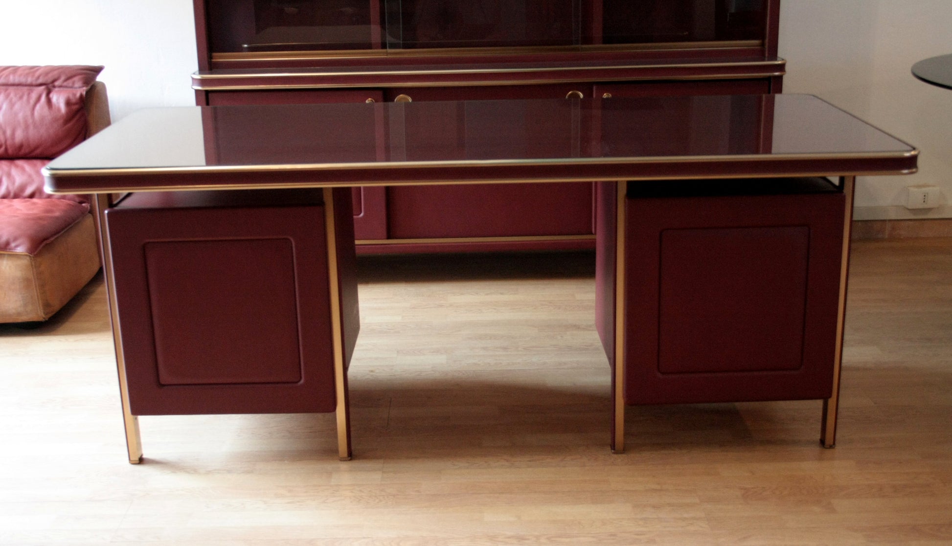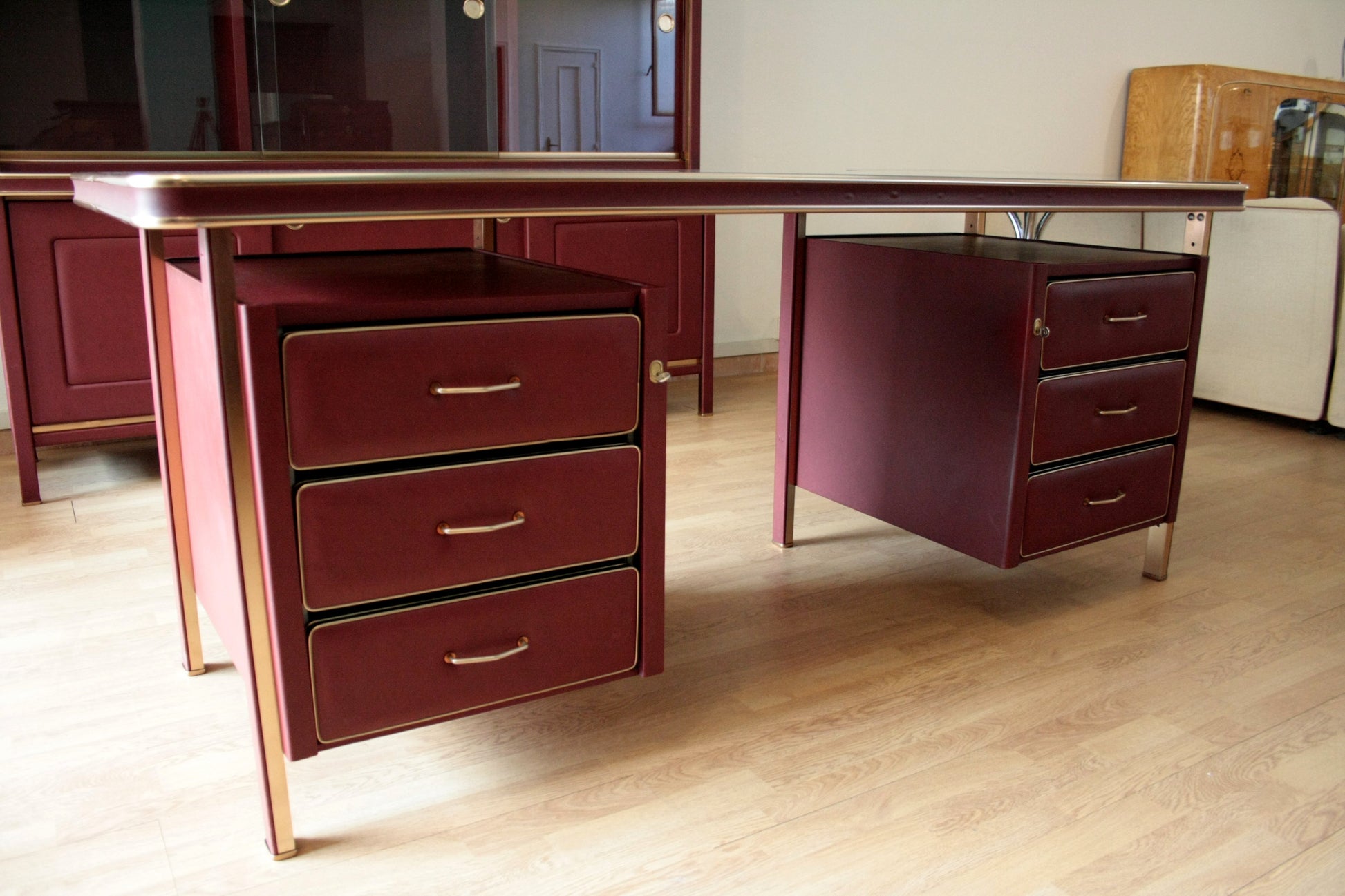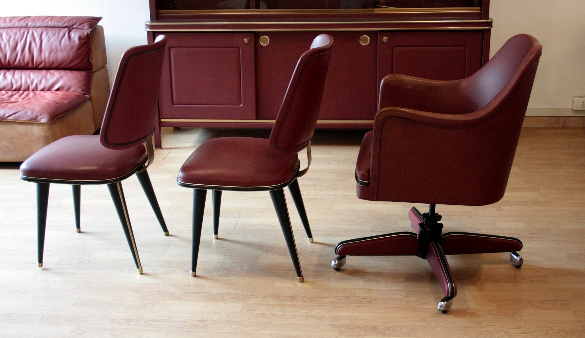 Set studio Umberto Mascagni, scrivania con tre sedie e libreria, in similpelle bordeaux e ottone, 1950 Italia