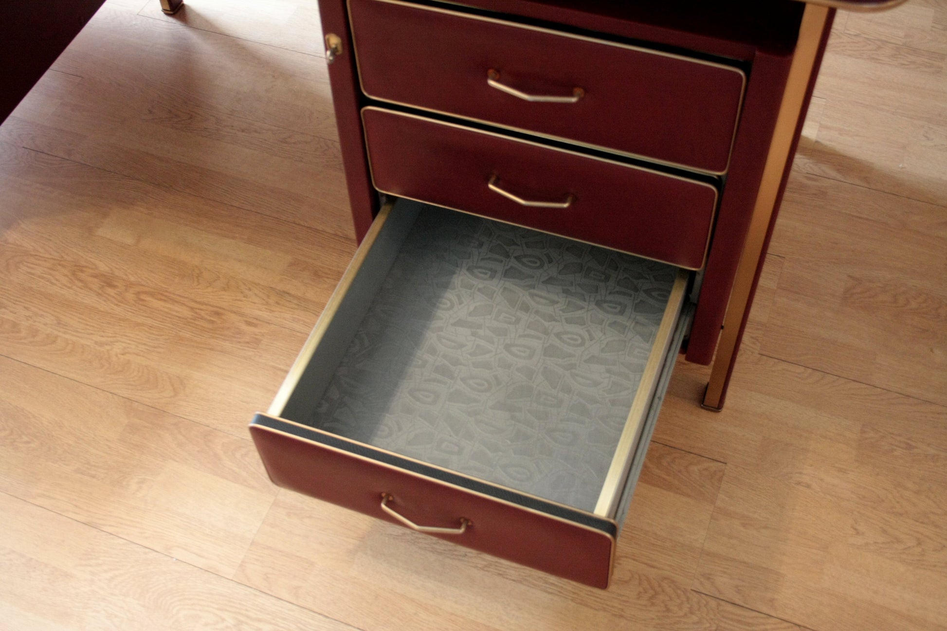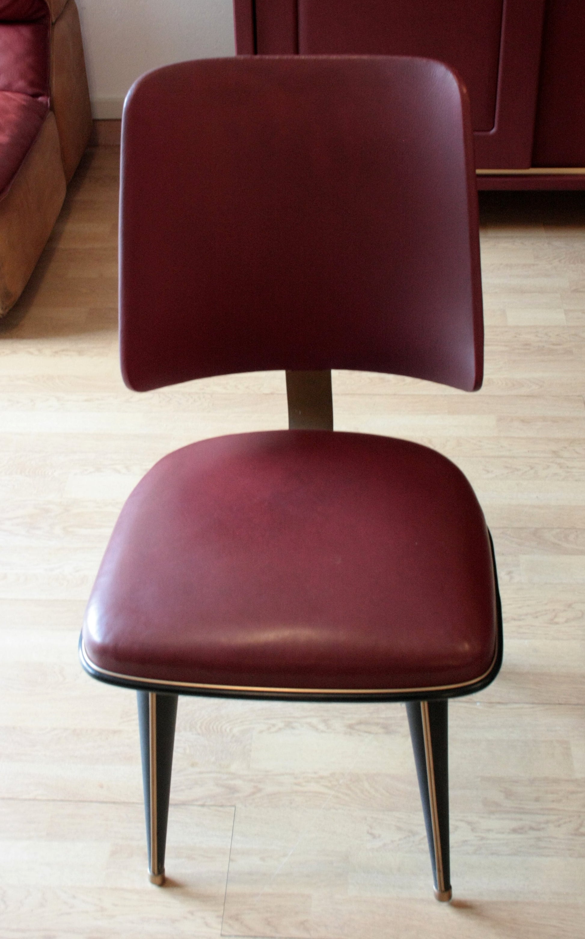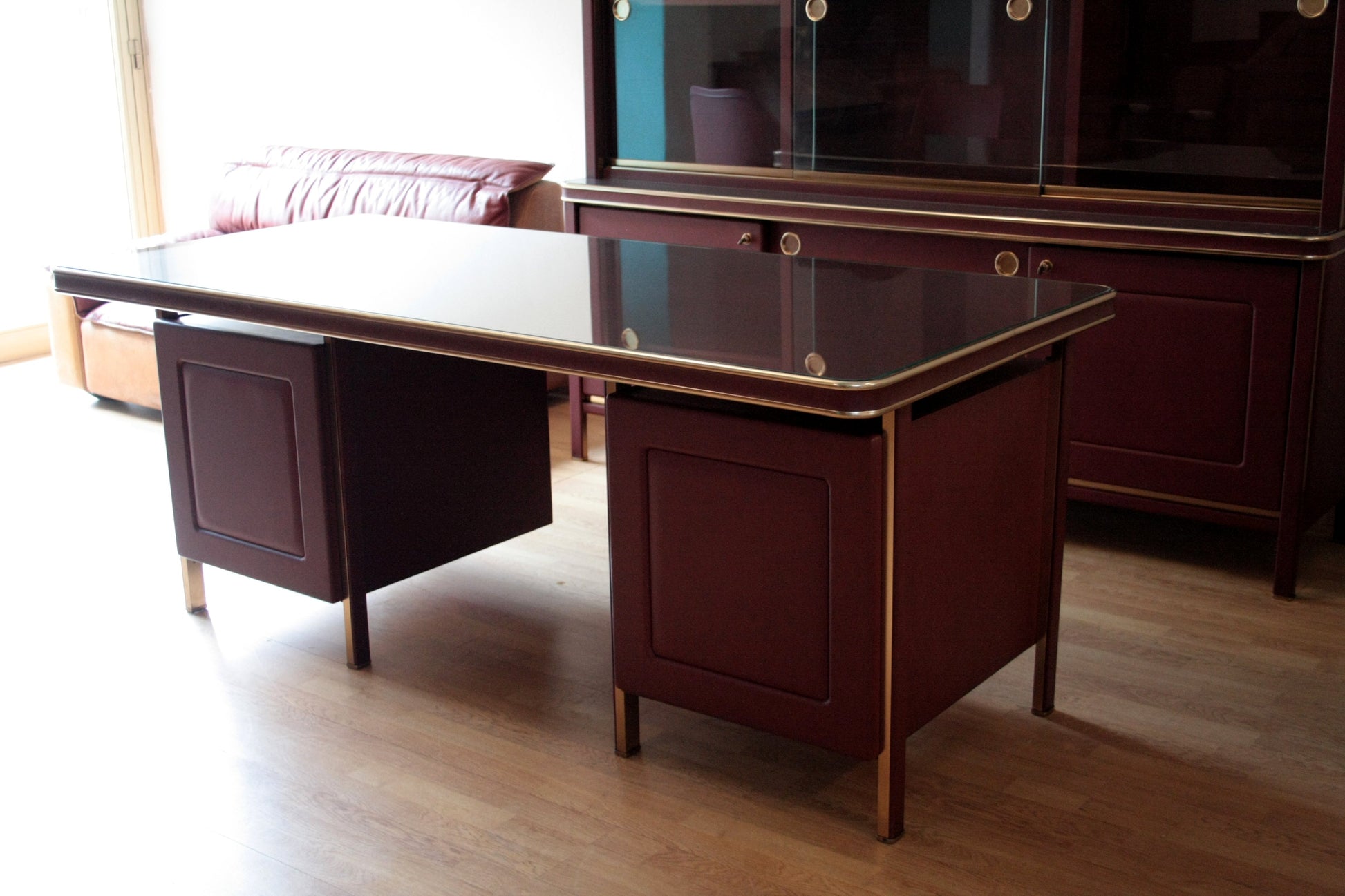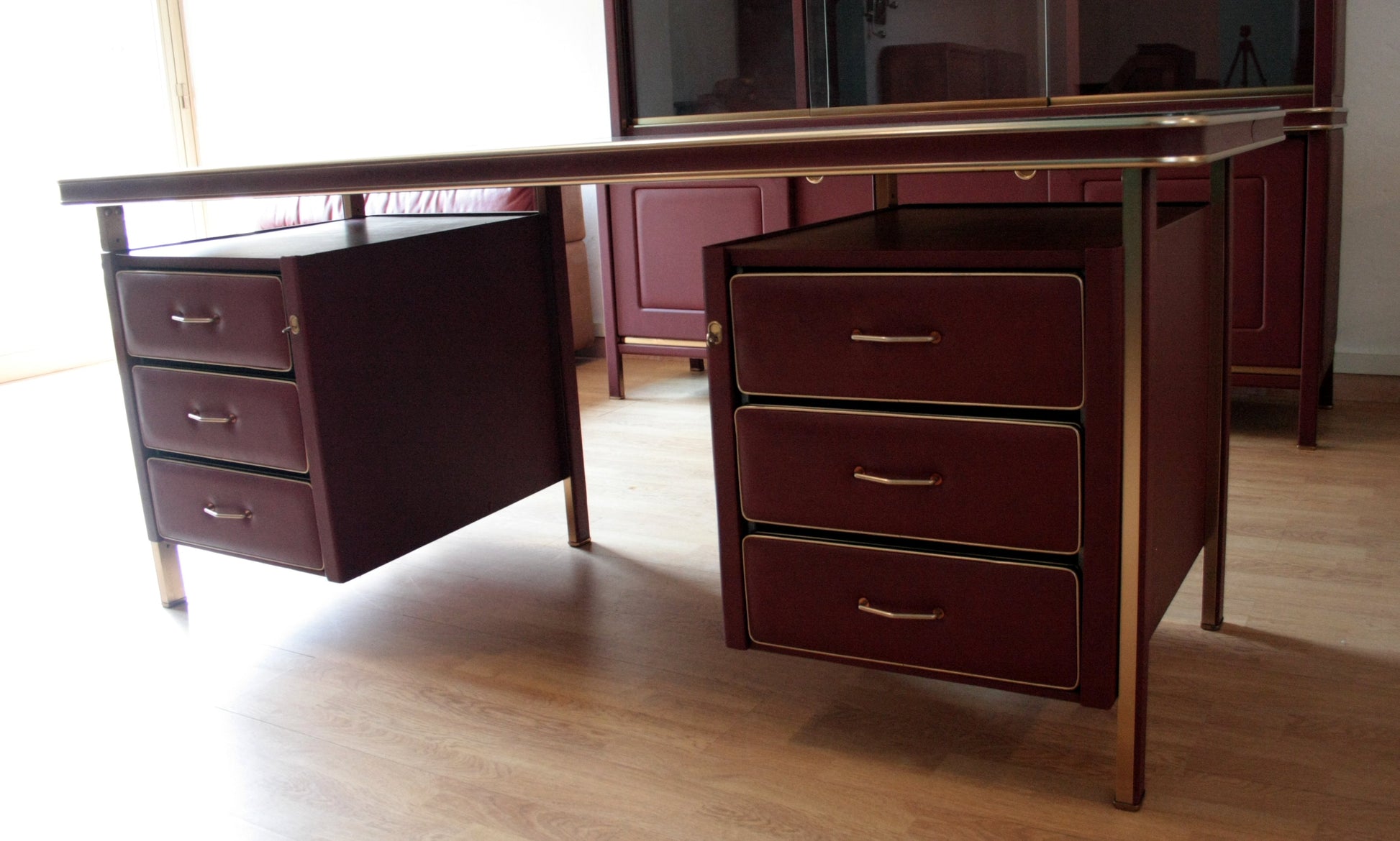 Set studio Umberto Mascagni, scrivania con tre sedie e libreria, in similpelle bordeaux e ottone, 1950 Italia