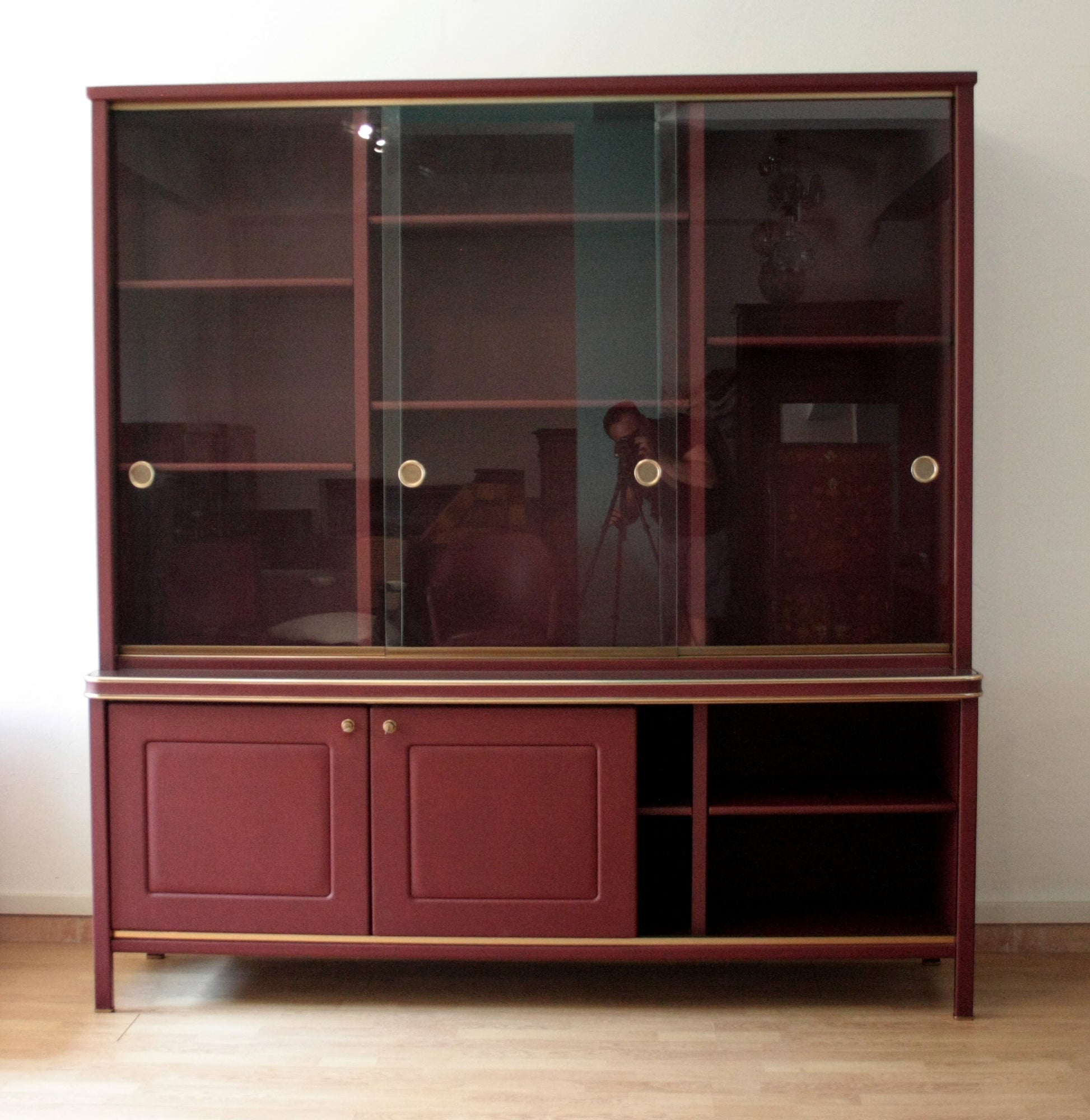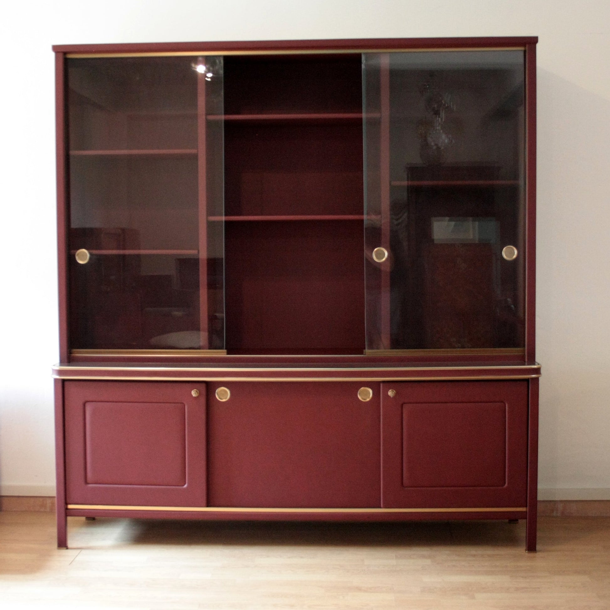 Credenza o libreria a due corpi, progettata da Umberto Mascagni negli anni '50, rappresenta un raffinato esempio di design italiano d’epoca. Rivestita in similpelle bordeaux, si distingue per le ante scorrevoli sia nella parte inferiore, dotata di chiavi di chiusura funzionanti, sia nella parte superiore con vetri, che permettono una visione elegante degli oggetti esposti. I profili in ottone aggiungono un tocco di classe e raffinatezza. L’elemento è in ottime condizioni di conservazione e completamente funzionante, con una lieve scheggiatura sul vetro destro, visibile nelle foto. Le dimensioni generose (200 cm di larghezza, 50 cm di profondità e 210 cm di altezza) la rendono ideale per chi cerca un pezzo d’arredo funzionale e di grande impatto estetico, perfetto per ambienti che valorizzano il vintage e il design d’autore.